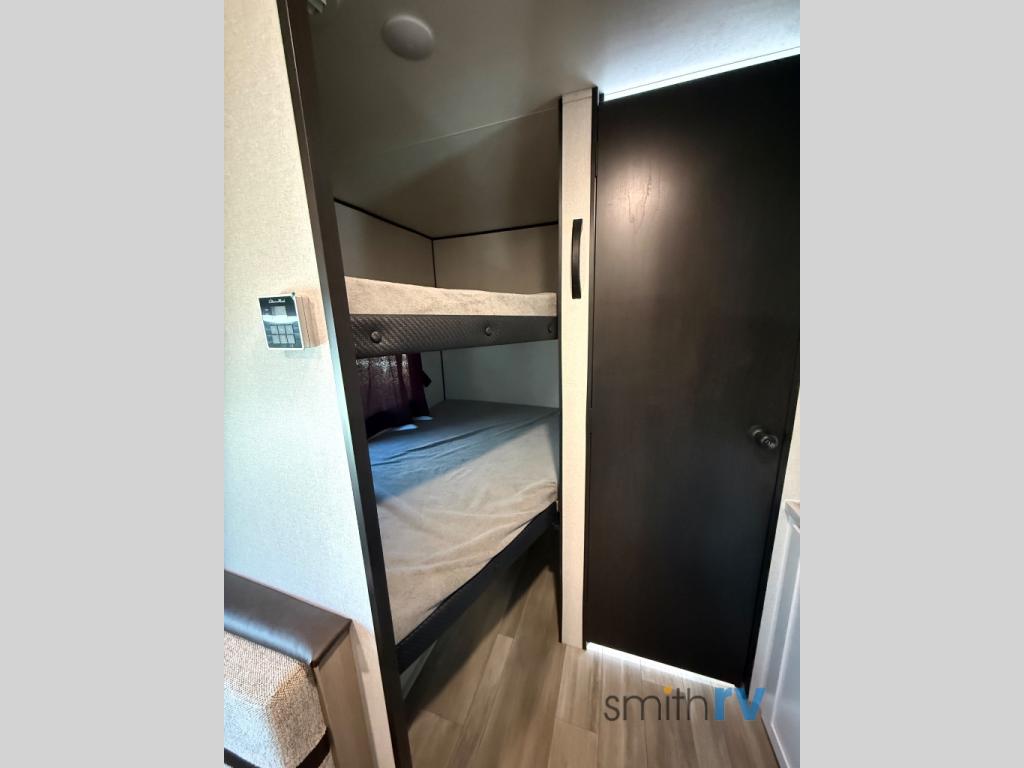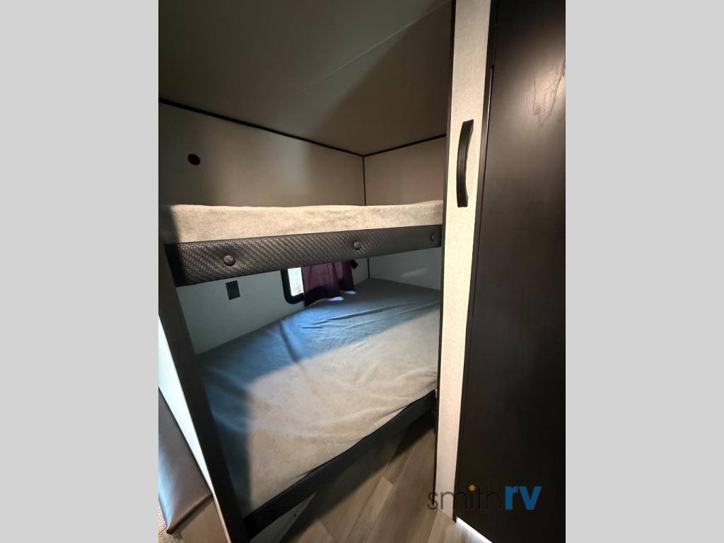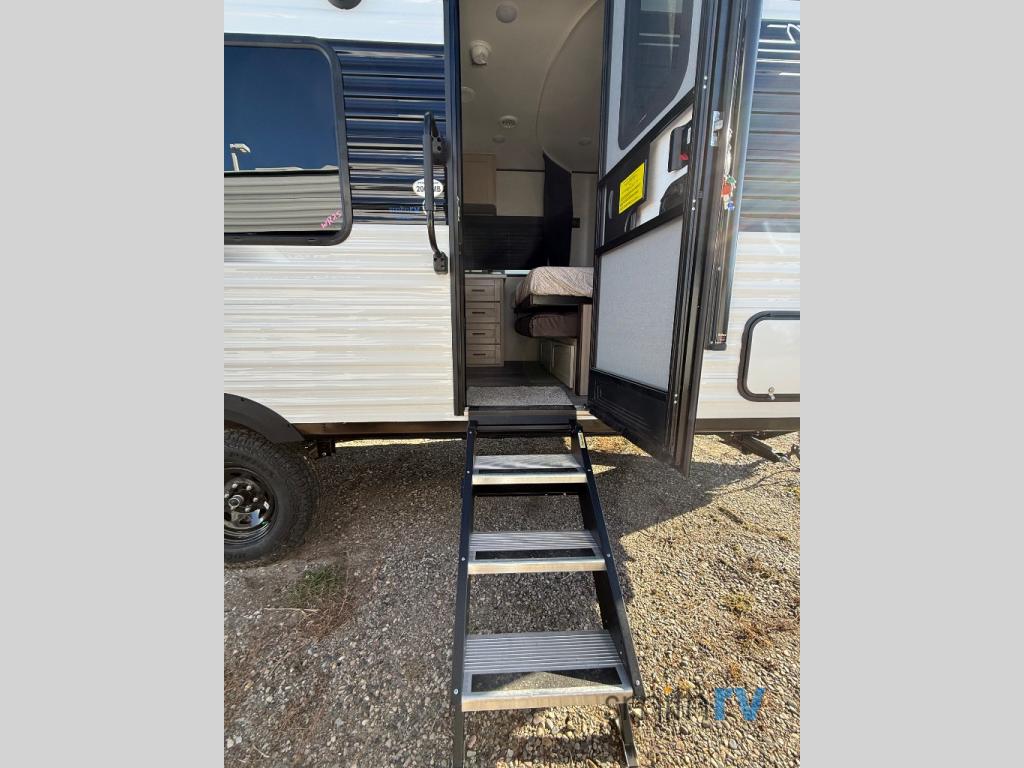 Camping trips are made easy in this travel trailer with double-size bunk beds for guests or little ones. There is a front Murphy bed that will provide you with more space during the day when you put it away to reveal the jack knife sofa. The rear corner full bath includes a foot-flush toilet, a 24" x 40" shower, so you won't have to leave the camper in the middle of the night. A three-burner cooktop and microwave oven will let you make meals each day, and you can dine at the booth dinette or take your plate outdoors to sit under the 16' power awning with LED lights!