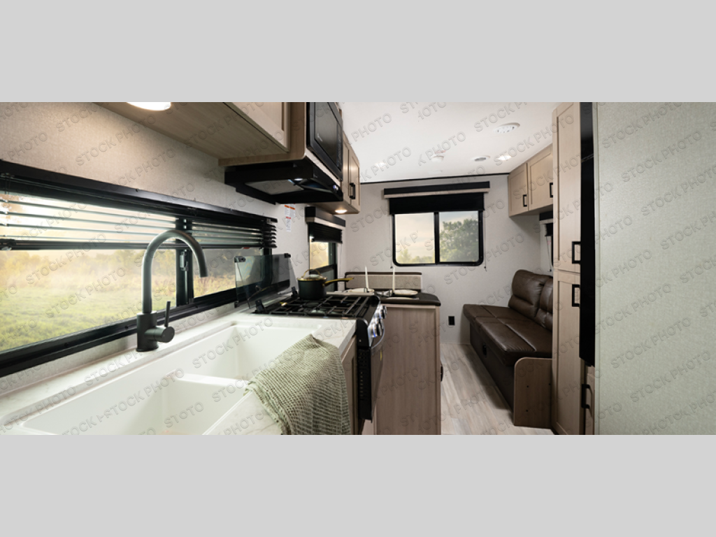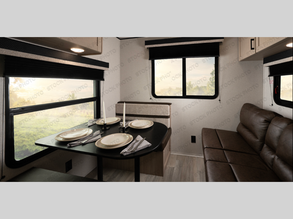 Weekend trips to the campground will be made unforgettable in this travel trailer for five to six. You will enjoy your own space in the front bedroom with a privacy curtain, RV queen bed and dual bedside wardrobes to keep your things tidy. If you have any guests staying over, then can convert the jack knife sofa and booth dinette back into seating spaces for breakfast in the morning. Speaking of breakfast, you'll have a three-burner cooktop and microwave oven to cook eggs and bacon, plus an 8-cu. ft. 12V refrigerator and pantry for food storage.