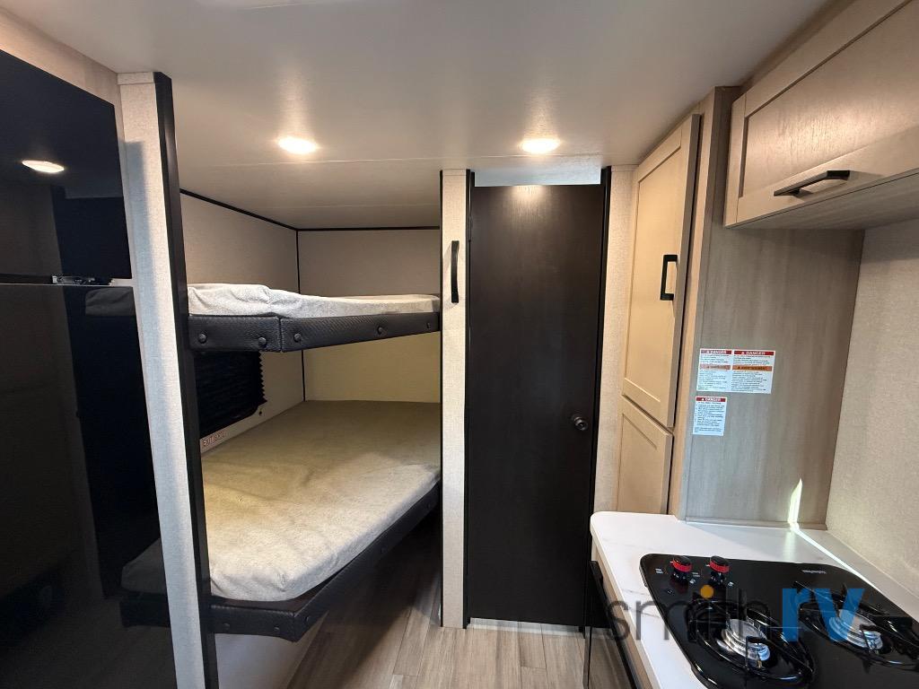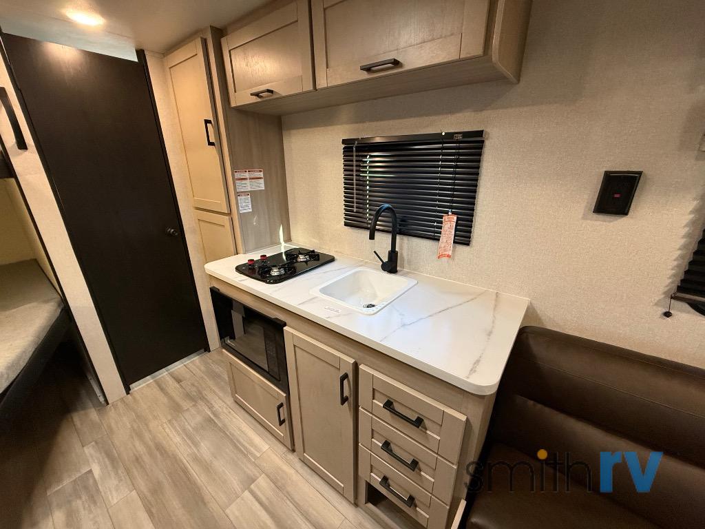 Camping trips are made easy in this Lynx Edition travel trailer with double-size bunk beds for guests or little ones. You'll find a front walk-around queen bed for a great night's rest, along with dual bedside wardrobes to keep your things tidy. The rear corner private bath includes a foot-flush toilet and a 40" shower, so you won't have to leave the camper in the middle of the night. A two-burner cooktop and microwave oven will let you make meals each day, and you'll find seating spaces at the booth dinette or on the sofa!