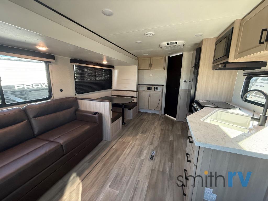 With any Prowler travel trailer, you will enjoy convenient amenities and at-home comforts wherever you decide to camp! Each one is built with a durable fully integrated A-frame, a TrussXL roof system, and galvanized wheel wells. And the self-adjusting brakes, easy-lube axles and nitrogen filled radial tires will provide smooth towing. Inside, you'll enjoy vinyl flooring throughout that will be easy to keep clean, durable, residential-inspired kitchen countertops, a residential-style high-rise kitchen faucet, and solid hardwood cabinet doors with hidden hinges and screwed stile construction. The mandatory Camping in Comfort Package includes a large folding entry door grab handle, MORryde Step Above entry steps, an on-demand tankless water heater, and stylish window shades. There are also available options that vary between single and double axle units that will allow you to customize your Prowler to fit your needs!