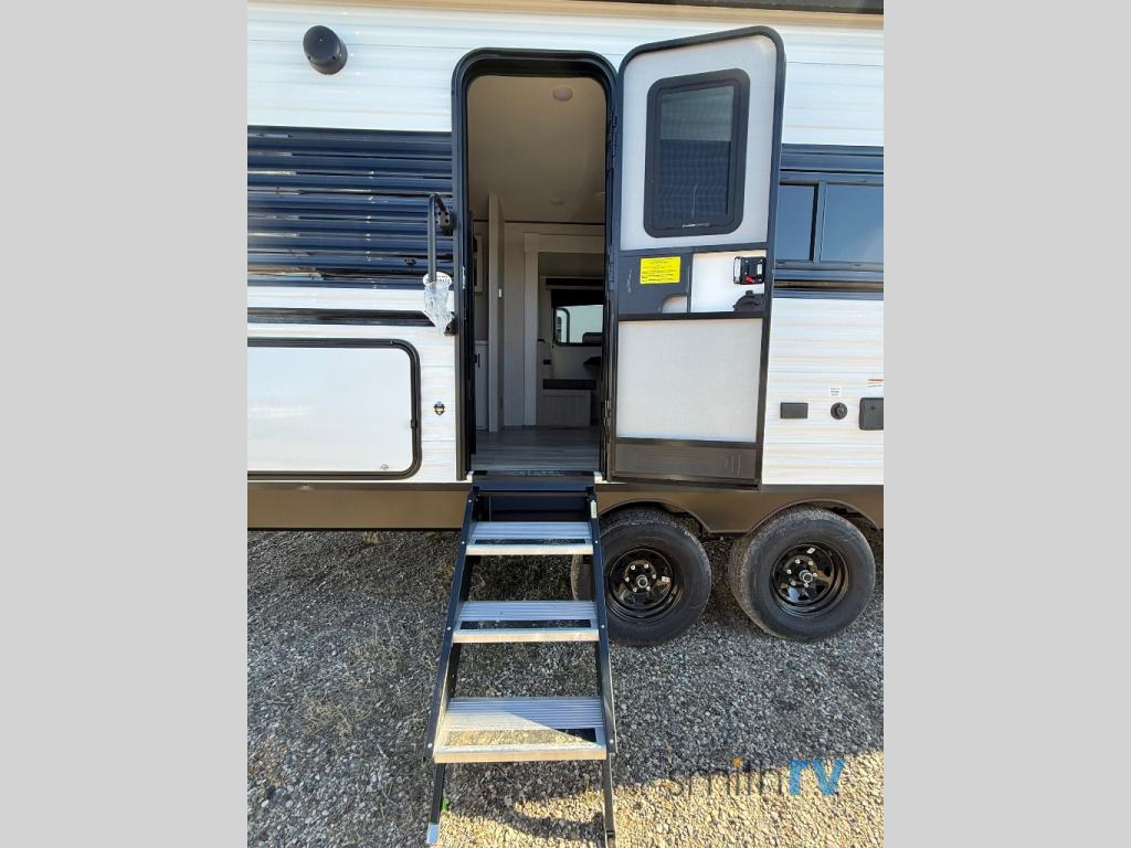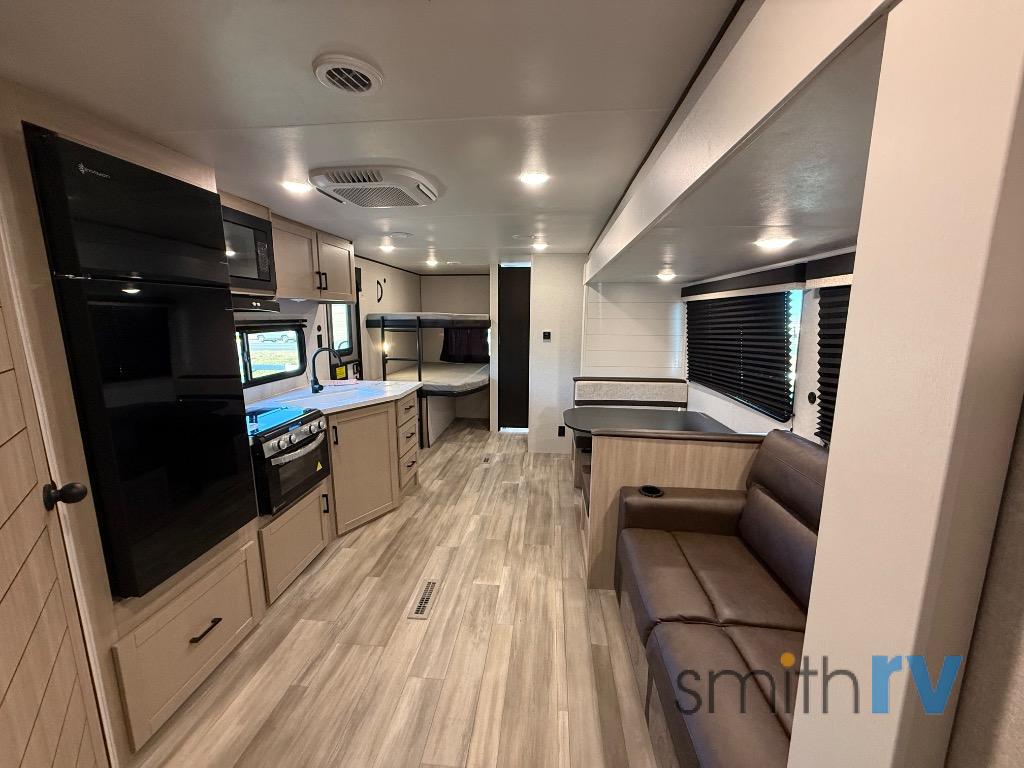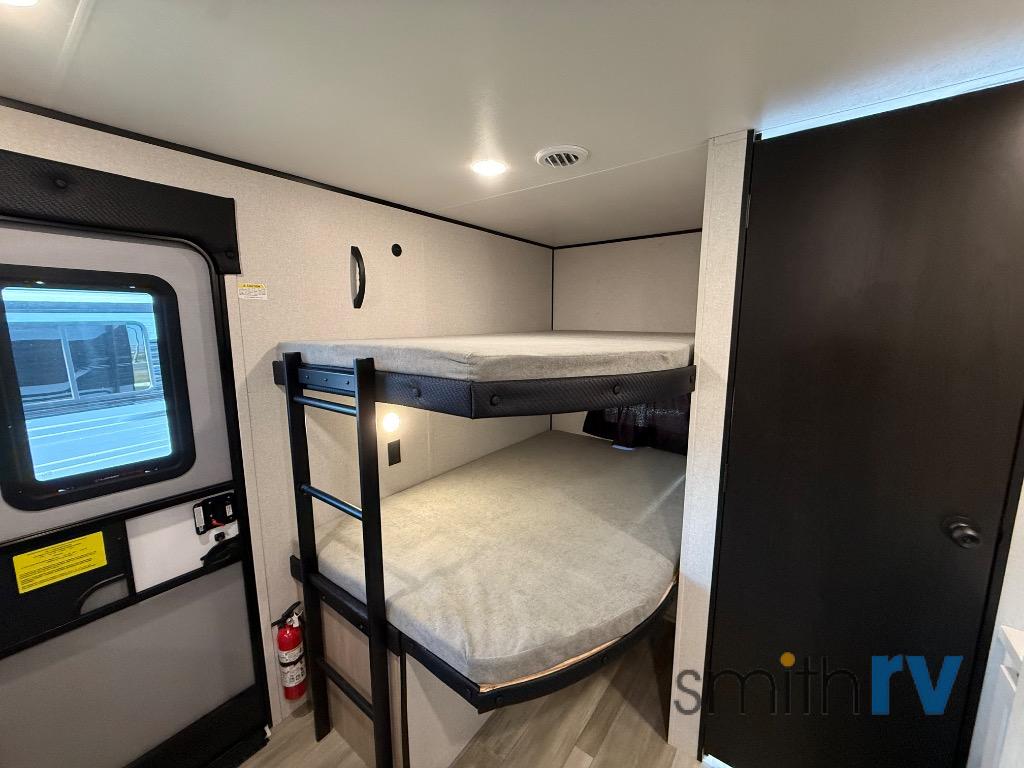 The whole gang will love weekends in the woods with this travel trailer in tow! There is a large slide out for added space, and here you'll find the jack-knife sofa and booth dinette. There is also an entertainment center with a fireplace with a hidden pantry behind, along with storage shelves for snacks, board games and more! You can claim the front private bedroom to yourselves, while your guests or little ones take the double-size bunks. A full kitchen is complete with a three-burner cooktop and microwave oven to make meals each day, plus a 12V refrigerator and pantry for food storage. This unit also includes an outdoor kitchen with a refrigerator to keep cold drinks ready to enjoy!