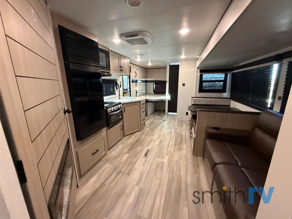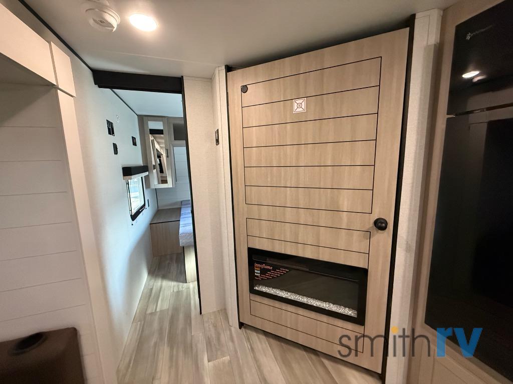 The whole gang will love weekends in the woods with this travel trailer in tow! There is a large slide out for added space, and here you'll find the jack-knife sofa and booth dinette. There is also an entertainment center with a fireplace with a hidden pantry behind, along with storage shelves for snacks, board games and more! You can claim the front private bedroom to yourselves, while your guests or little ones take the double-size bunks. A full kitchen is complete with a three-burner cooktop and microwave oven to make meals each day, plus a 12V refrigerator and pantry for food storage. This unit also includes an outdoor kitchen with a refrigerator to keep cold drinks ready to enjoy!