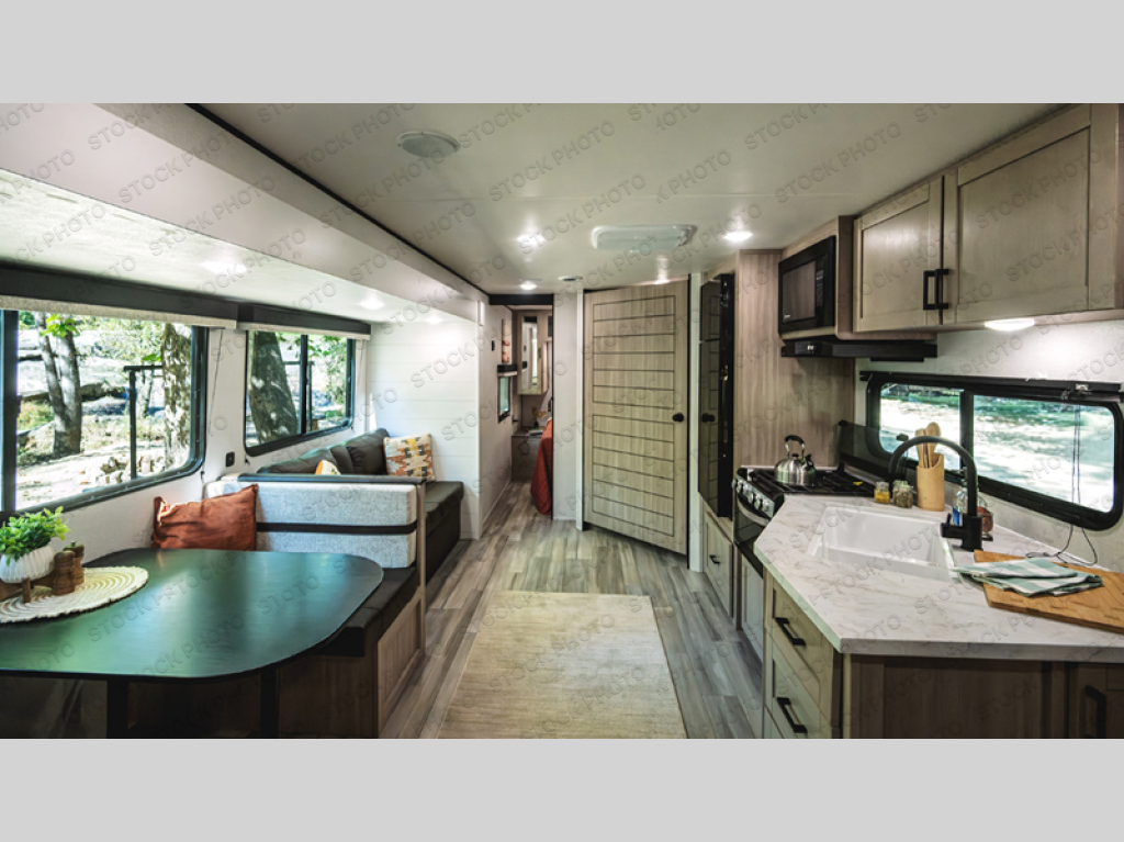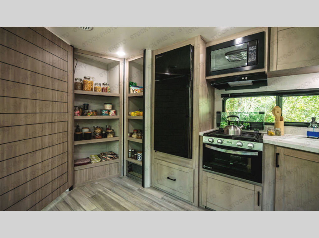 The whole gang will love weekends in the woods with this travel trailer in tow! There is a large slide out for added space, and here you'll find the jack-knife sofa and booth dinette. There is also an entertainment center with a fireplace with a hidden pantry behind, along with storage shelves for snacks, board games and more! You can claim the front private bedroom to yourselves, while your guests or little ones take the double-size bunks. A full kitchen is complete with a three-burner cooktop and microwave oven to make meals each day, plus a 12V refrigerator and pantry for food storage. This unit also includes an outdoor kitchen with a refrigerator to keep cold drinks ready to enjoy!