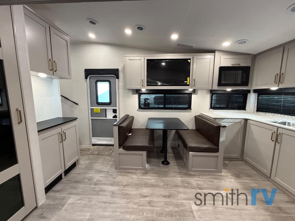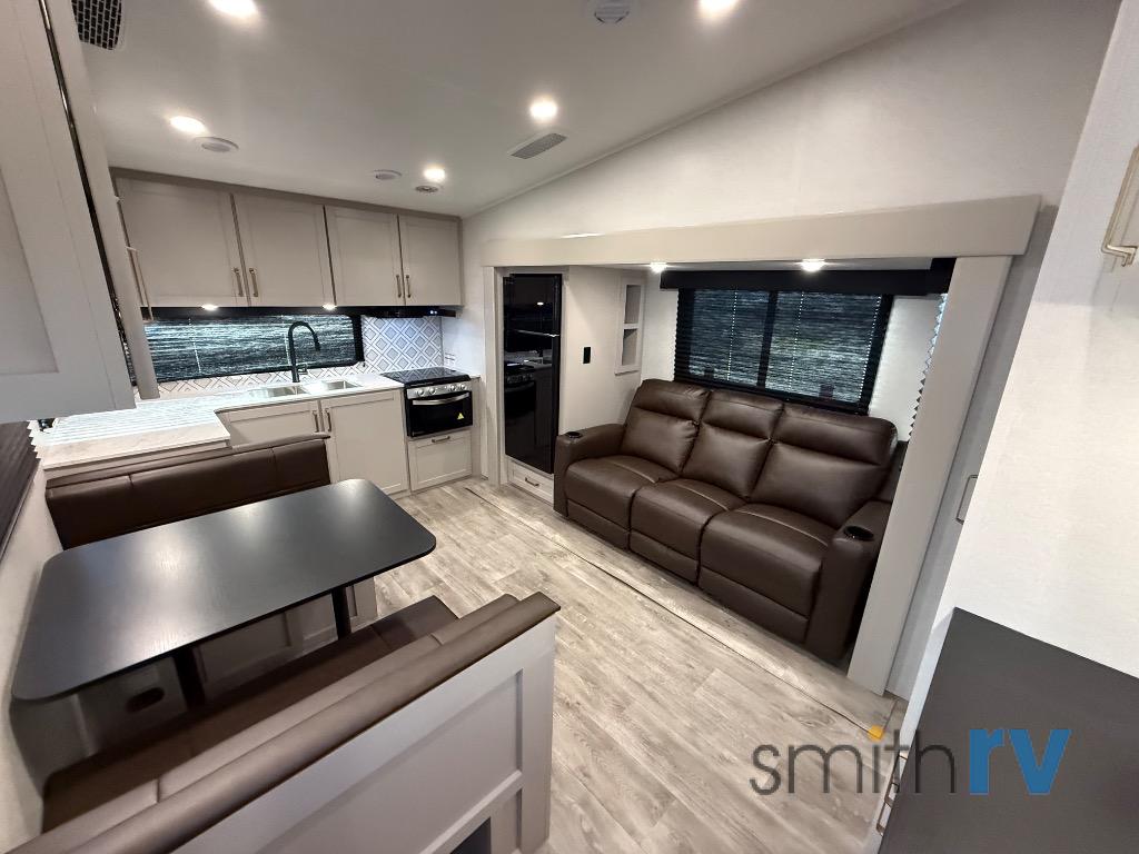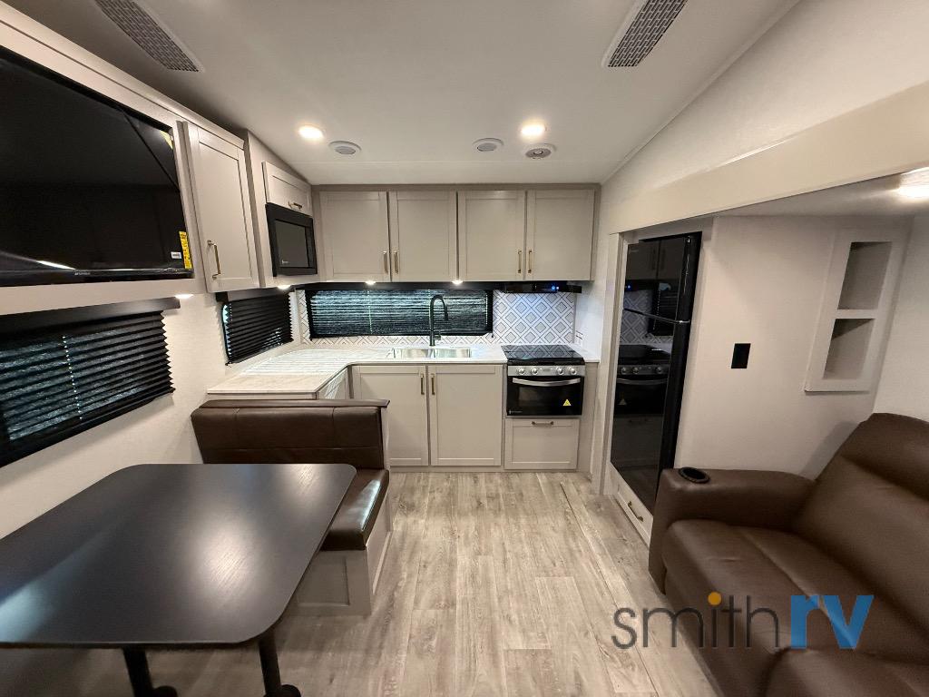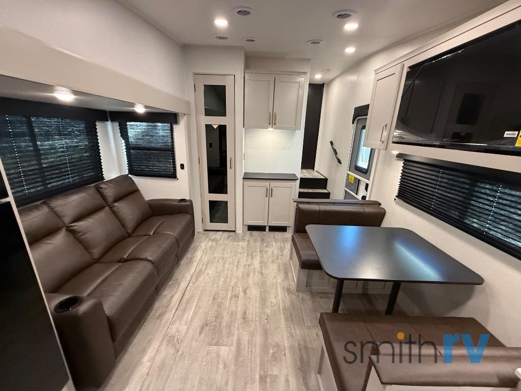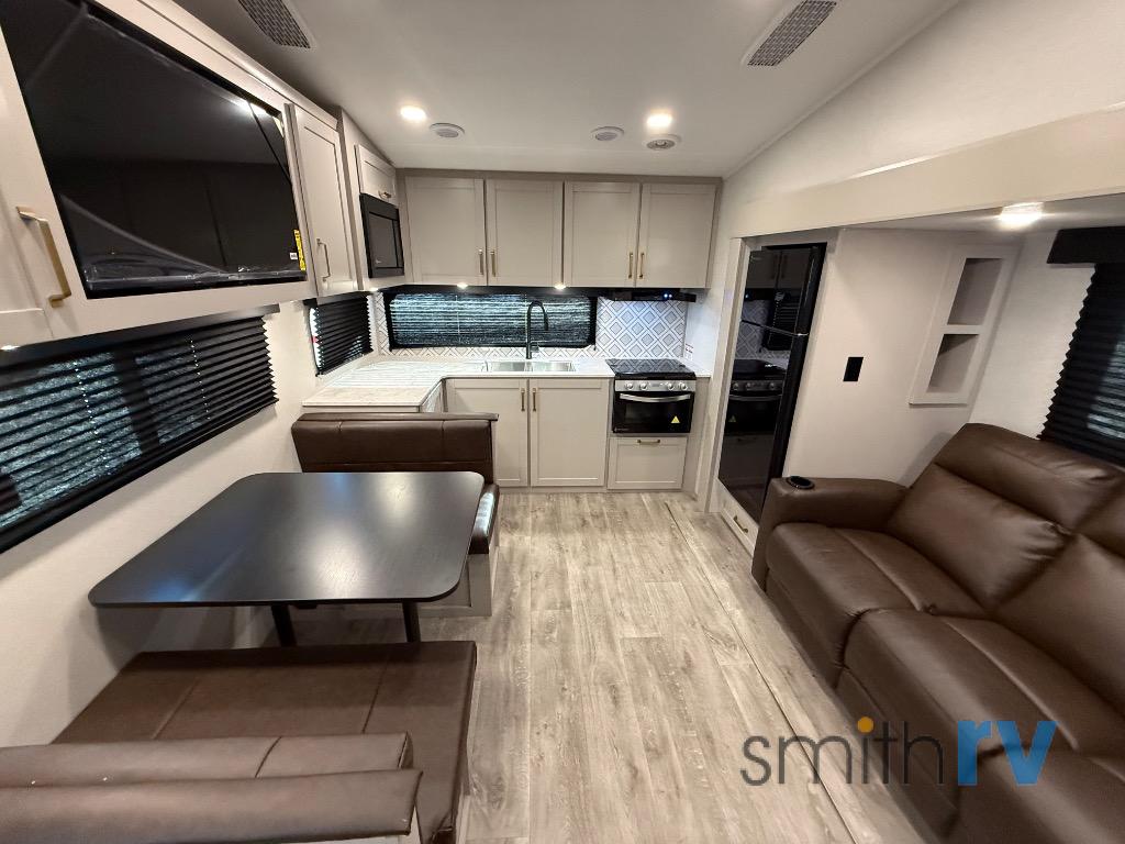 The fifth wheel you were waiting for! The spacious rear kitchen is equipped with a three-burner cooktop, microwave, booth dinette, 12V refrigerator, and sink, providing ample space for meal preparation. Overhead cabinets and a pantry provide ample storage for cookware, dishes, and other essential kitchen items. The living area features a trifold sofa, perfect for relaxation and entertainment. The full bathroom’s thoughtful design ensures that everyone has their own space, and the front bedroom is a retreat from the world, featuring a plush queen bed, a spacious wardrobe, and a closet.