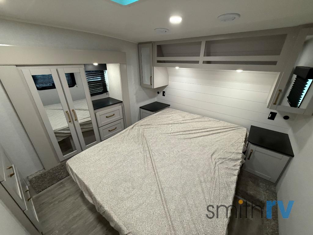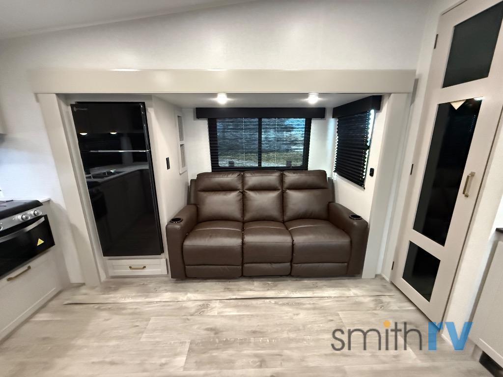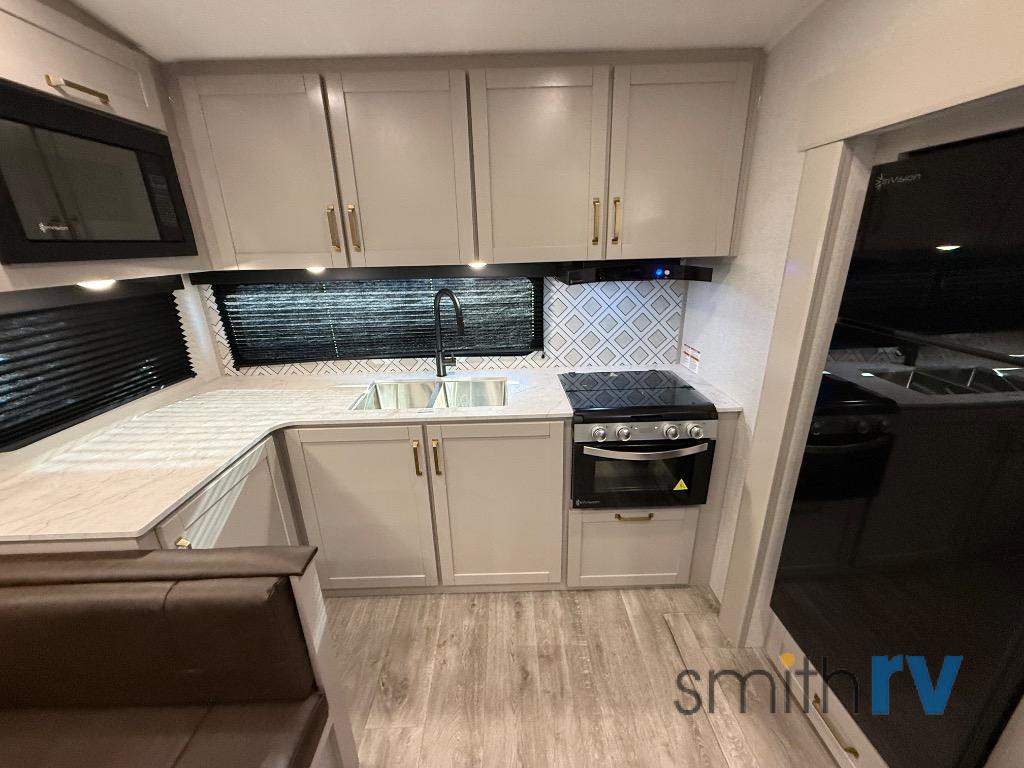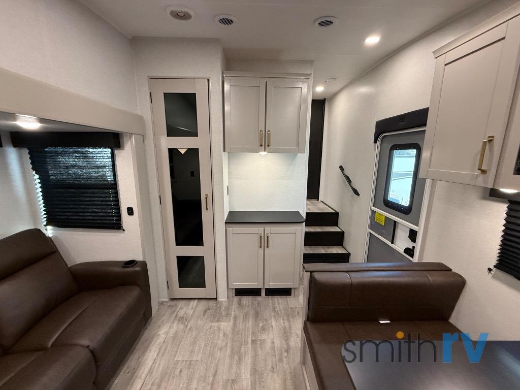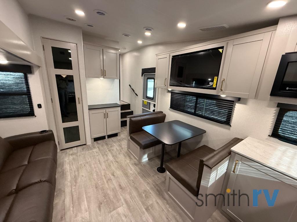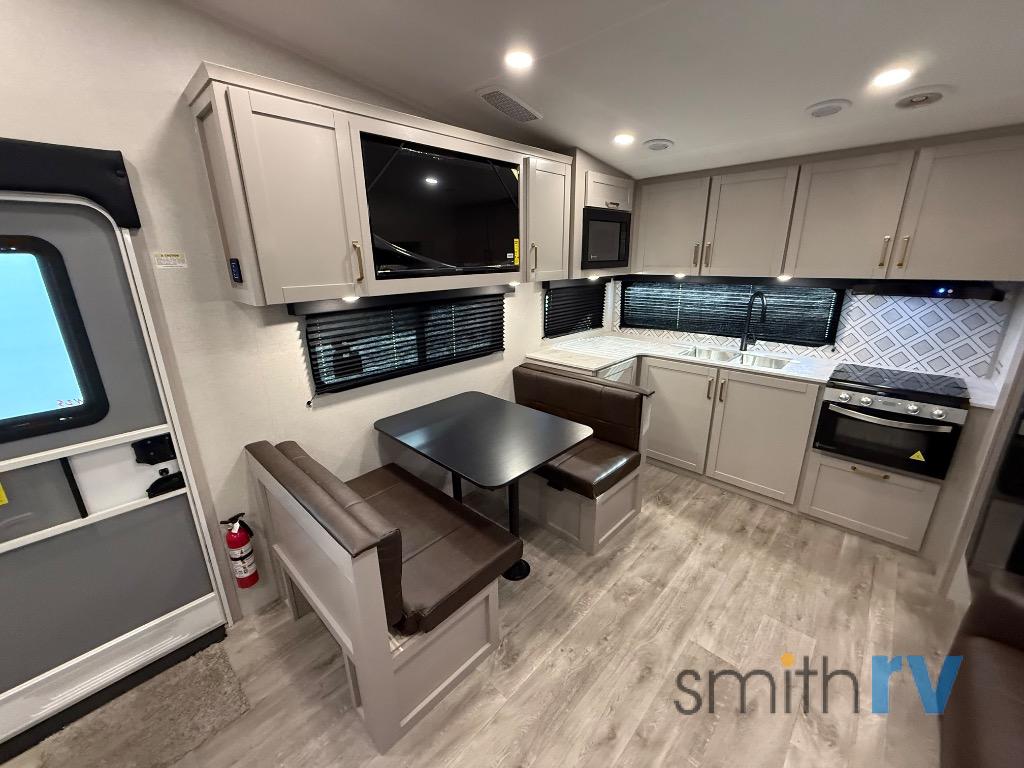 The fifth wheel you were waiting for! The spacious rear kitchen is equipped with a three-burner cooktop, microwave, booth dinette, 12V refrigerator, and sink, providing ample space for meal preparation. Overhead cabinets and a pantry provide ample storage for cookware, dishes, and other essential kitchen items. The living area features a trifold sofa, perfect for relaxation and entertainment. The full bathroom’s thoughtful design ensures that everyone has their own space, and the front bedroom is a retreat from the world, featuring a plush queen bed, a spacious wardrobe, and a closet.