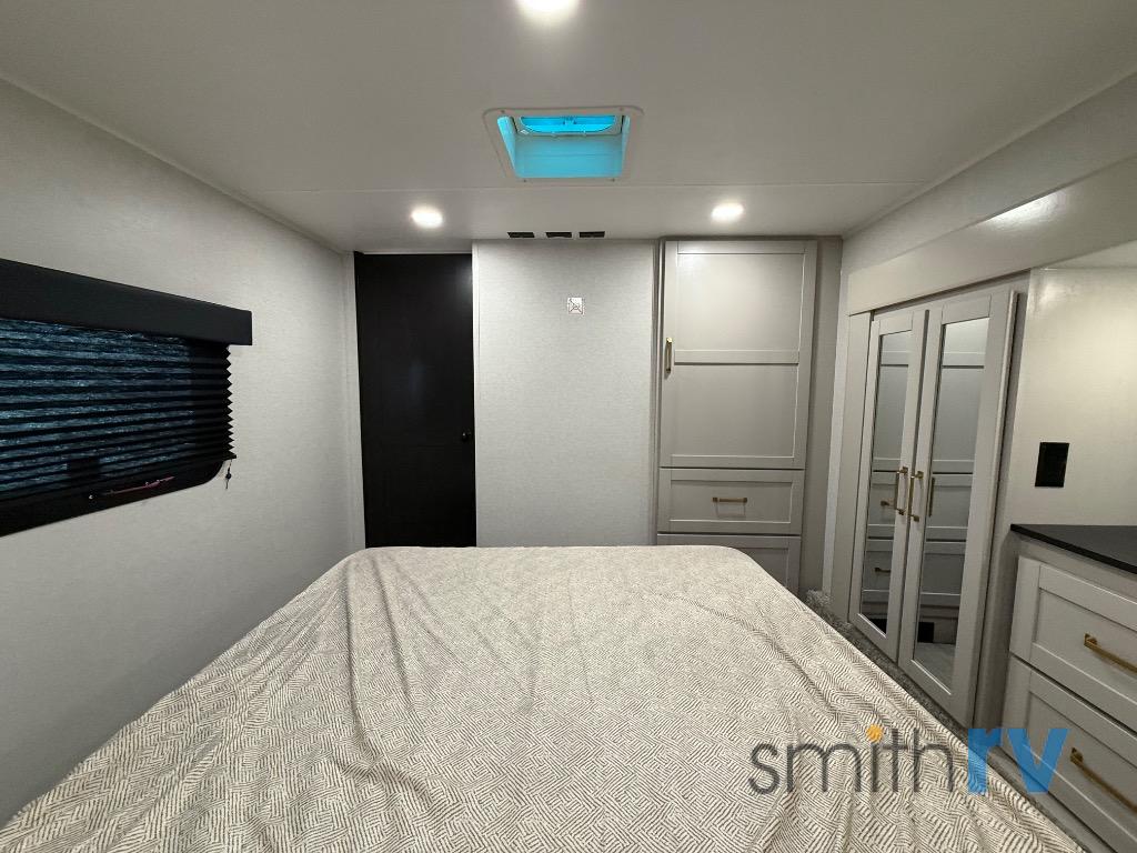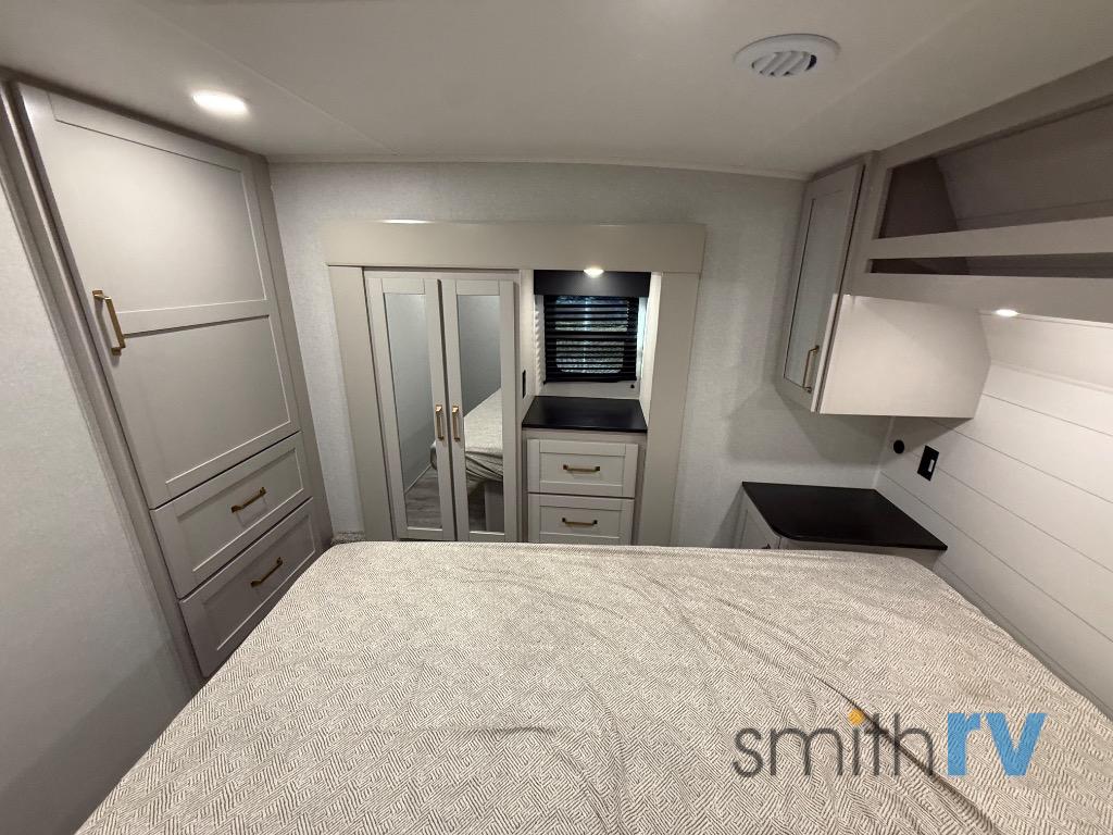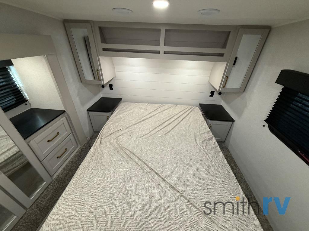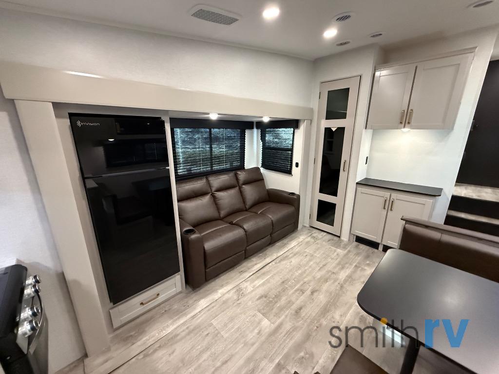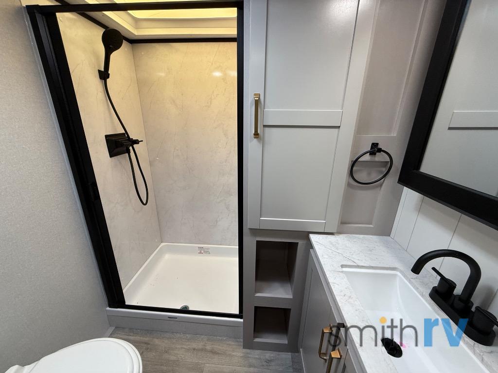 The fifth wheel you were waiting for! The spacious rear kitchen is equipped with a three-burner cooktop, microwave, booth dinette, 12V refrigerator, and sink, providing ample space for meal preparation. Overhead cabinets and a pantry provide ample storage for cookware, dishes, and other essential kitchen items. The living area features a trifold sofa, perfect for relaxation and entertainment. The full bathroom’s thoughtful design ensures that everyone has their own space, and the front bedroom is a retreat from the world, featuring a plush queen bed, a spacious wardrobe, and a closet.