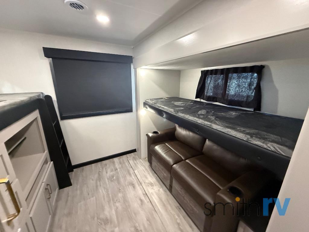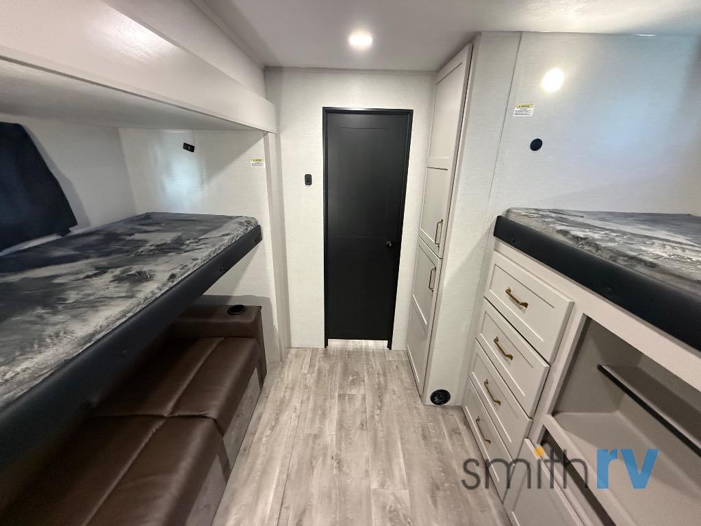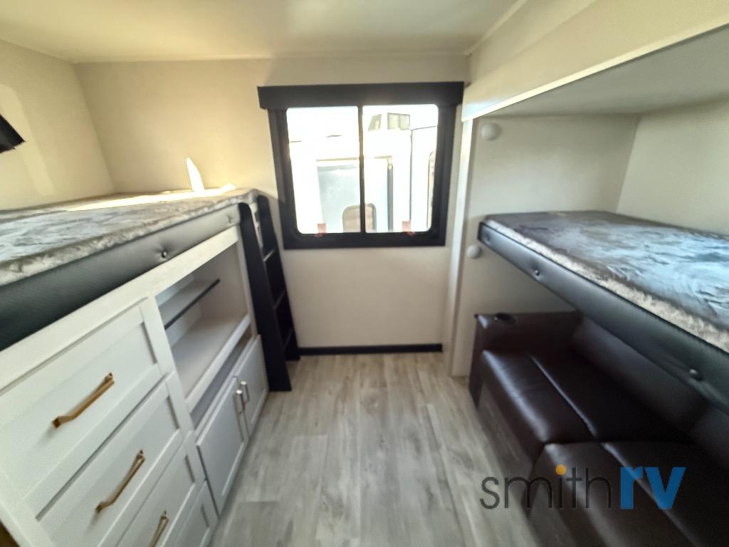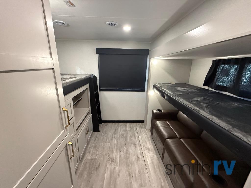At the front of this travel trailer, the private bedroom offers a comfortable retreat with a 66" x 80" Olympic bed, flanked by wardrobes on each side, plus overhead cabinets and an additional corner wardrobe perfect for storing clothes and camping gear. Just down the hall, the bathroom features a 30" x 36" shower, a medicine cabinet with a custom-framed mirror, and a linen cabinet to keep towels easily accessible. The spacious main living area is made even more open by dual opposing slides. One slide includes the entertainment center, a three-burner range, pantry, and a 10-cu. ft. refrigerator for all your cooking and storage needs, while the central kitchen island equipped with a sink and pull-out sprayer adds functionality and convenience. Opposite that, the second slide features a 60" tri-fold sleeper sofa and booth dinette, offering ample seating and additional sleeping space. At the rear, the dedicated bunkhouse includes a 39" x 73" bunk, a top bunk on the opposite side, and a 60" tri-fold sofa below ensuring everyone has a cozy place to rest after a day full of adventure.