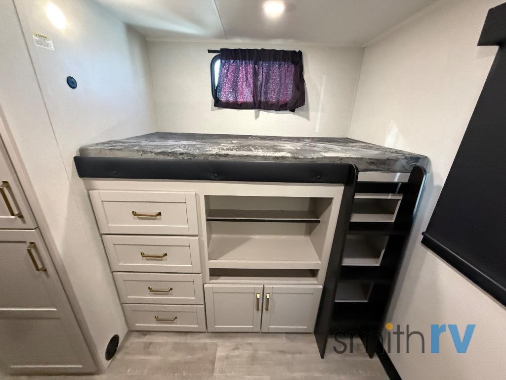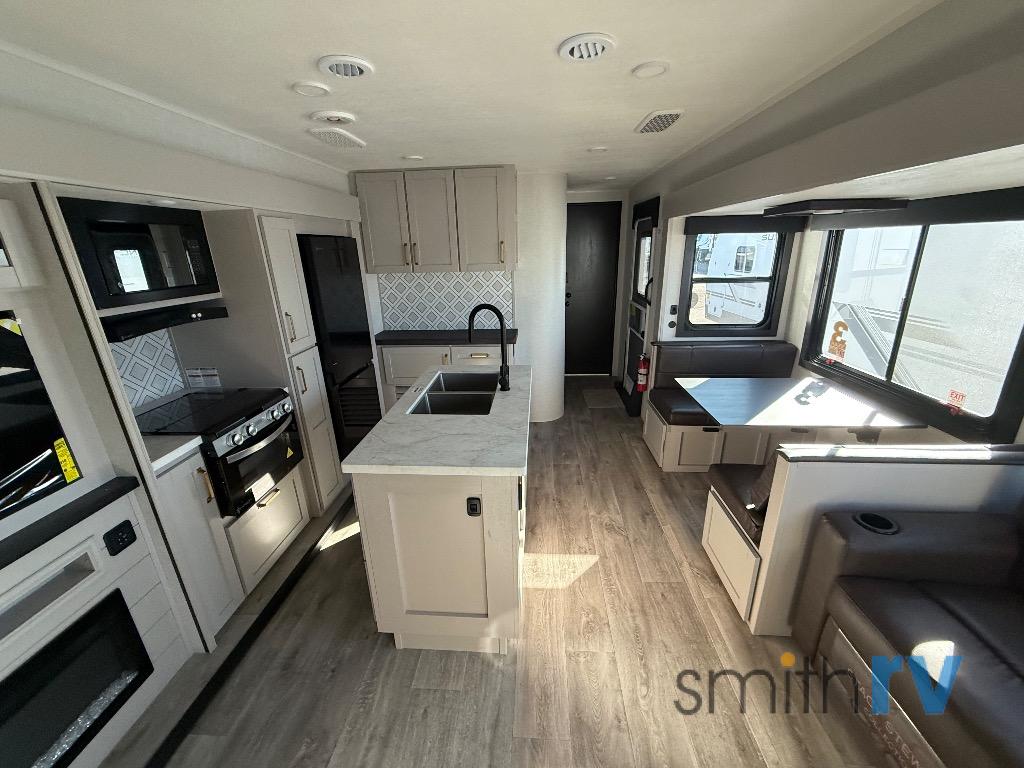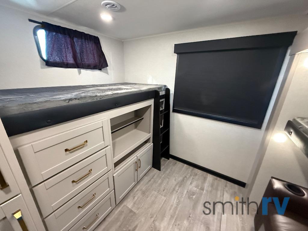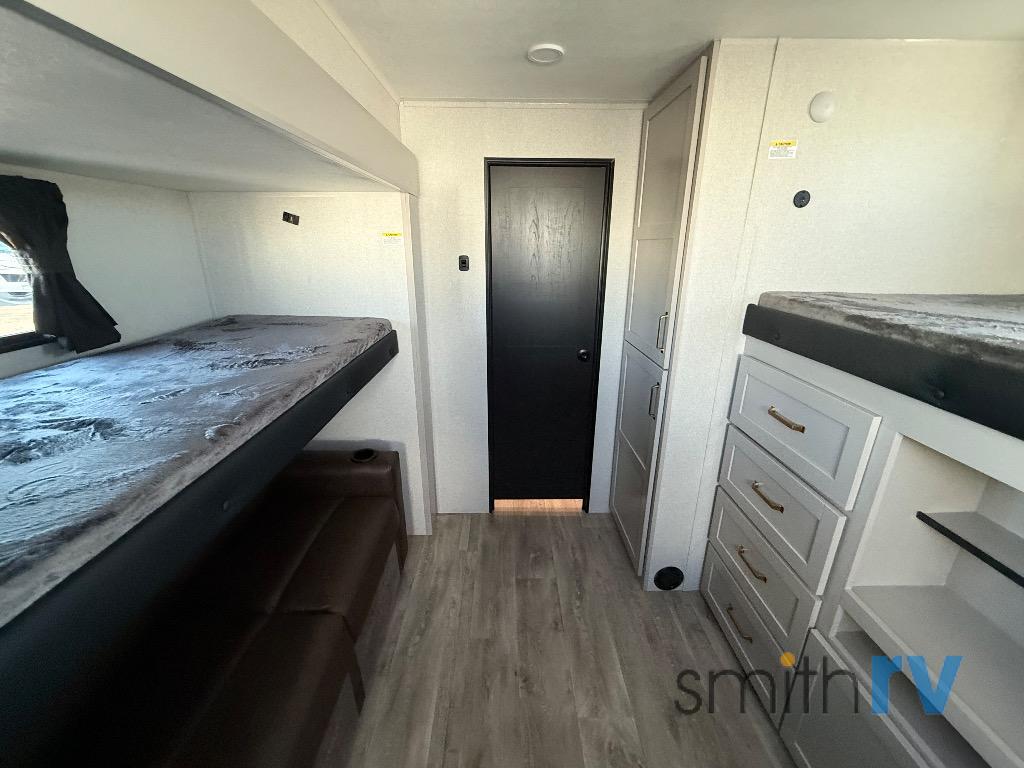 At the front of this travel trailer, the private bedroom offers a comfortable retreat with a 66" x 80" Olympic bed, flanked by wardrobes on each side, plus overhead cabinets and an additional corner wardrobe perfect for storing clothes and camping gear. Just down the hall, the bathroom features a 30" x 36" shower, a medicine cabinet with a custom-framed mirror, and a linen cabinet to keep towels easily accessible. The spacious main living area is made even more open by dual opposing slides. One slide includes the entertainment center, a three-burner range, pantry, and a 10-cu. ft. refrigerator for all your cooking and storage needs, while the central kitchen island equipped with a sink and pull-out sprayer adds functionality and convenience. Opposite that, the second slide features a 60" tri-fold sleeper sofa and booth dinette, offering ample seating and additional sleeping space. At the rear, the dedicated bunkhouse includes a 39" x 73" bunk, a top bunk on the opposite side, and a 60" tri-fold sofa below ensuring everyone has a cozy place to rest after a day full of adventure.