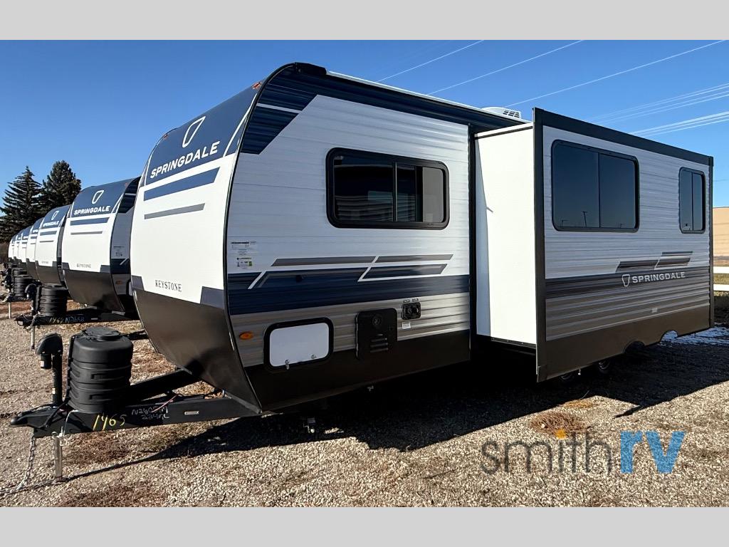 The Springdale Classic travel trailers by Keystone will provide you and your family many great outdoor experiences and it will also be kind to your pocketbook. Each one is constructed with a walkable roof and an I-beam frame with stamped steel cross-members and outriggers for added strength. There are also heavy duty stabilizer jacks and power tongue jacks outside, along with an XL entry assist handle for added convenience. Each travel trailer includes LED lighting, bedside outlets, and blackout night shades inside that will provide you with more privacy at night.