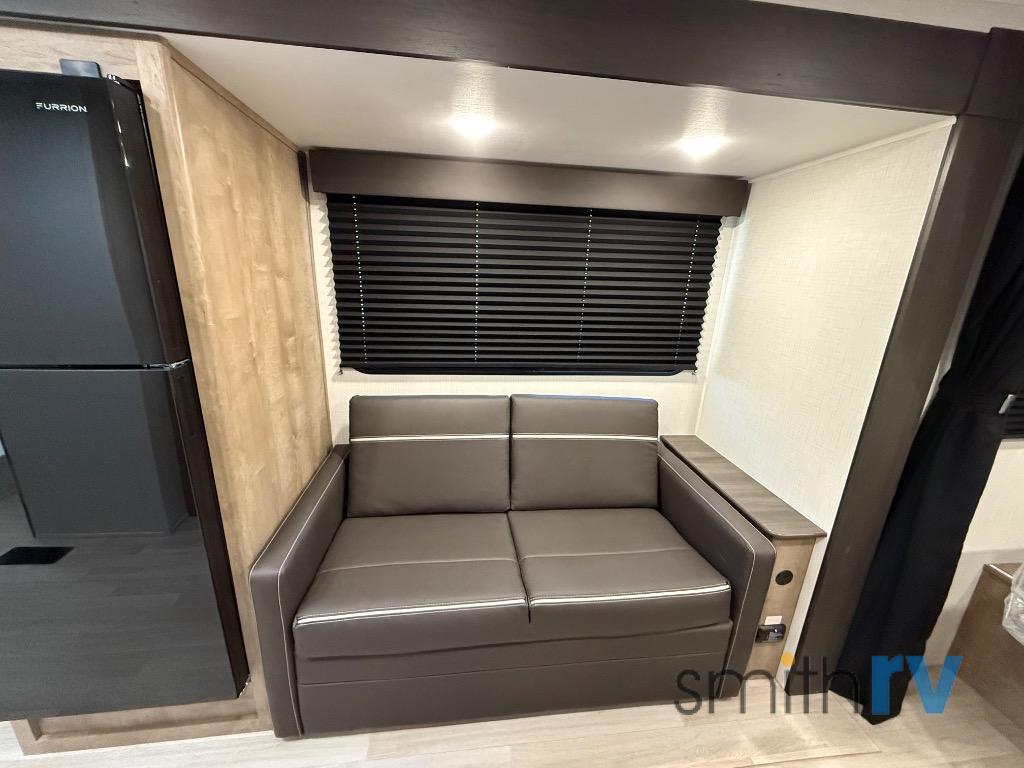 You'll love the added space in this travel trailer thanks to the large slide out. Here, you'll find the sofa with an end table, plus the 12V refrigerator and three burner gas range. There is kitchen counter space in the rear corner, and you'll find the full bath in the other rear corner for easy use. The front queen bed includes a privacy curtain for when you have guests staying over on the sofa and booth dinette, plus there are dual bedside closets and nightstands for your things!