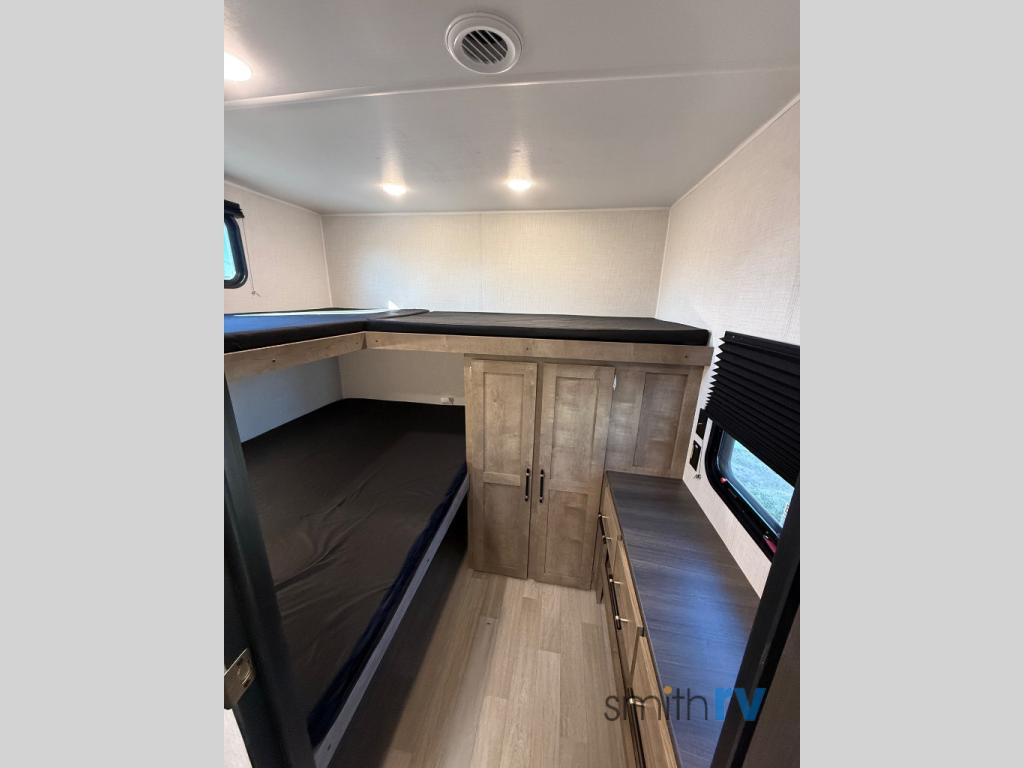 Camping with friends and family is easier than ever in this spacious trailer with a rear private bunkhouse! You'll find triple bunks in this room, along with a dresser and closet to keep everything tidy. The front private bedroom will feel just like home with its queen bed, plus dual closets and dual nightstands. Your crew can all gather in the main living area to relax on the sofa or play a game at the booth dinette, and there is even TV prep in this room if you enjoy movie nights. Head outdoors to relax under the 16' power awning.
