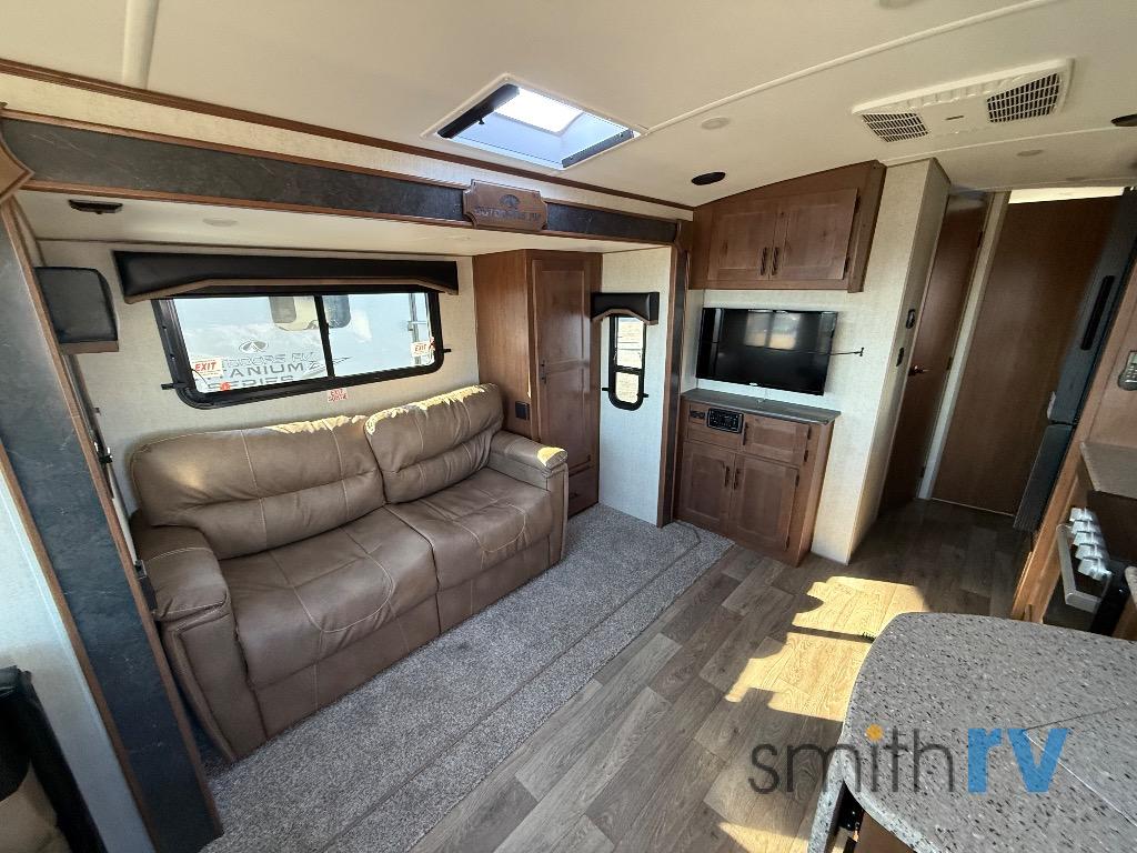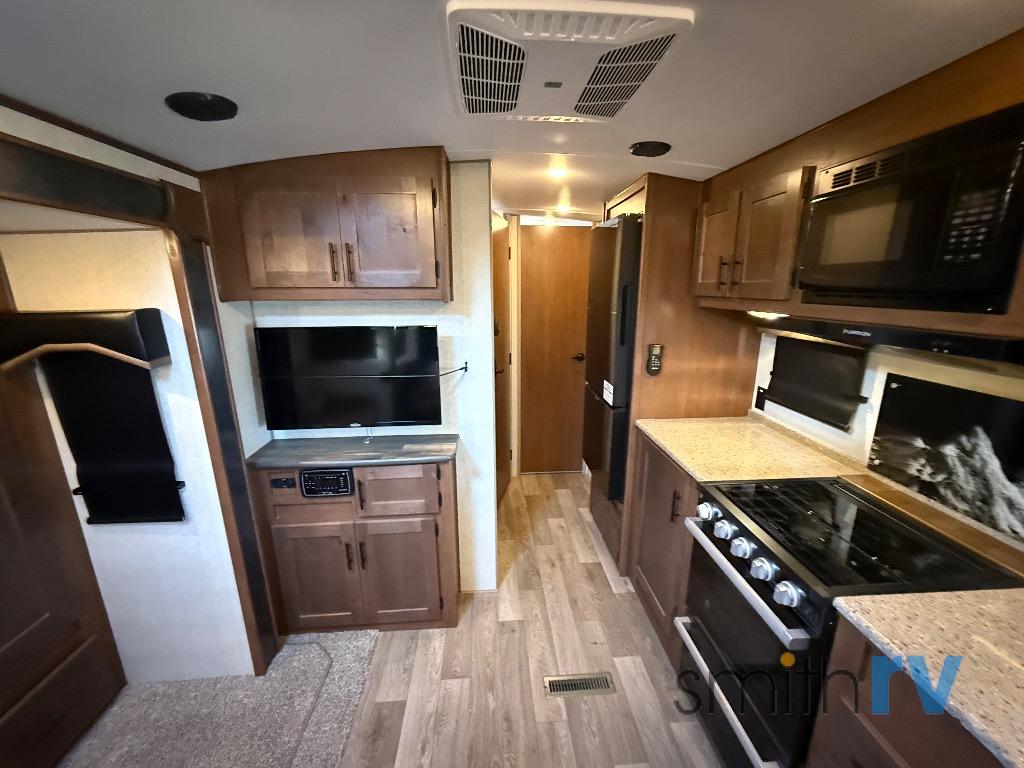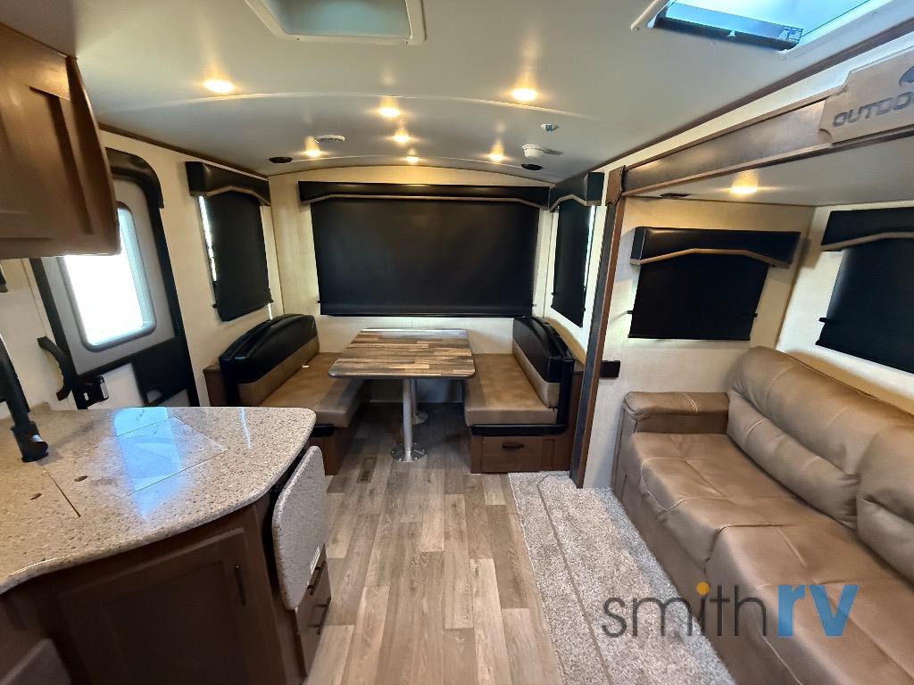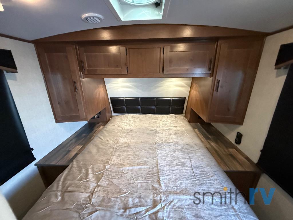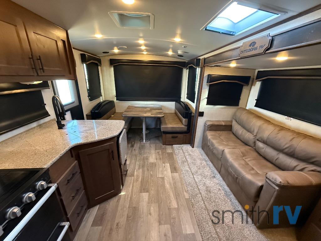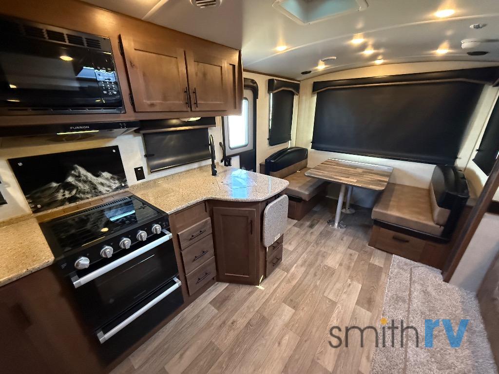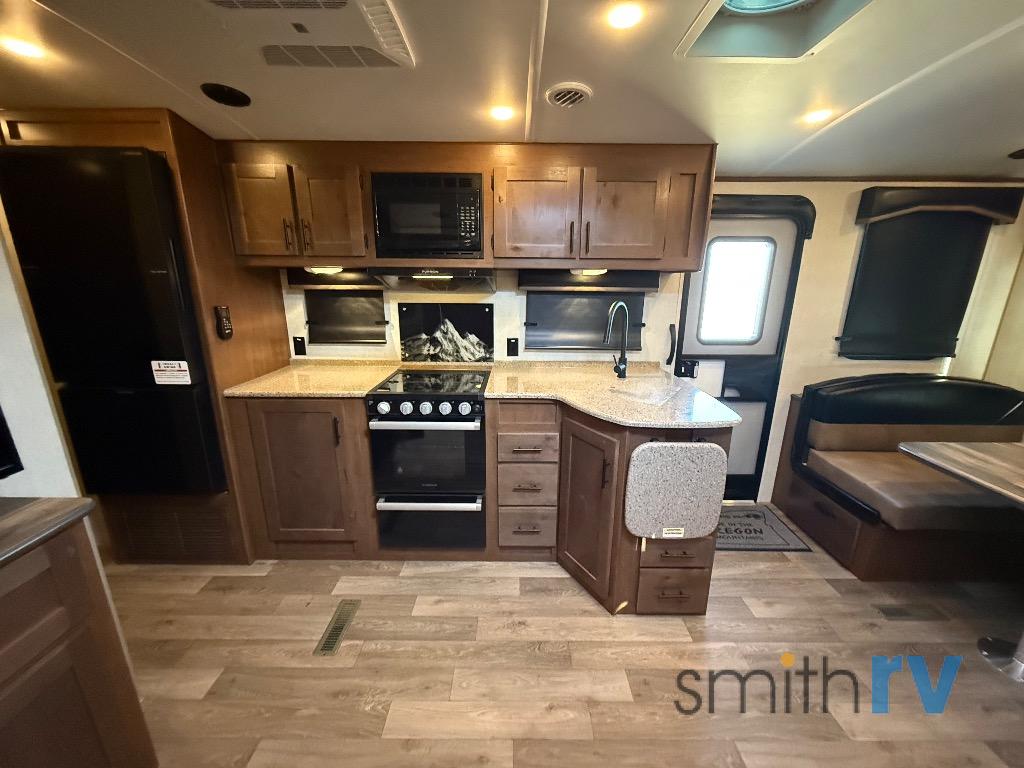 Camping trips are made complete when you have this travel trailer in tow. The rear mountain dinette provides a place to enjoy meals together, and the sleeper sofa slide out is close to the entertainment center for easy viewing of your movies. And if you're not needing the extra sleeping space, you can choose the optional residential sofa with built-in recliners! The chef of your group can prepare home-cooked meals in the kitchen, especially with a flip-up counter for more space. There is also a pantry, sunken range, 10 cu. ft. 12V refrigerator, plus a high-rise pull out faucet for easy clean up. The full bath is towards the front of the unit where you'll find the private bedroom, complete with a queen bed and plenty of storage space for clothes, shoes, and more!