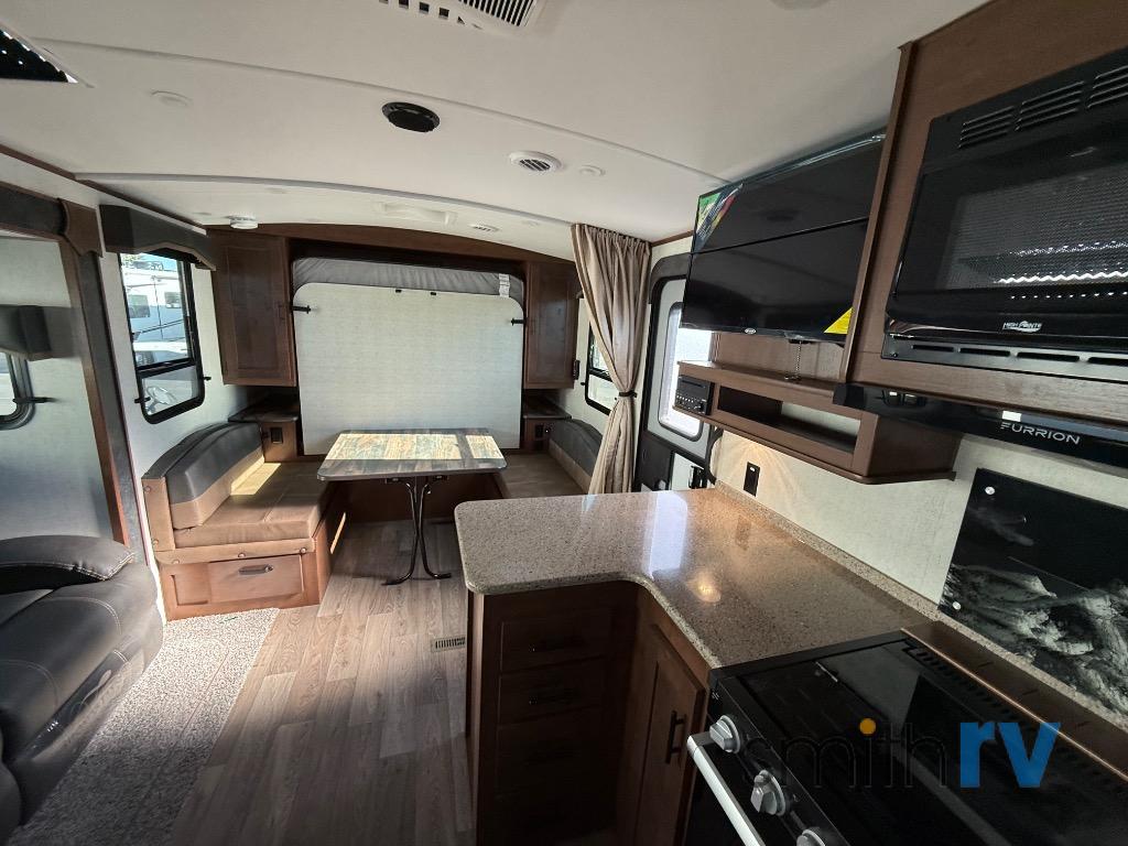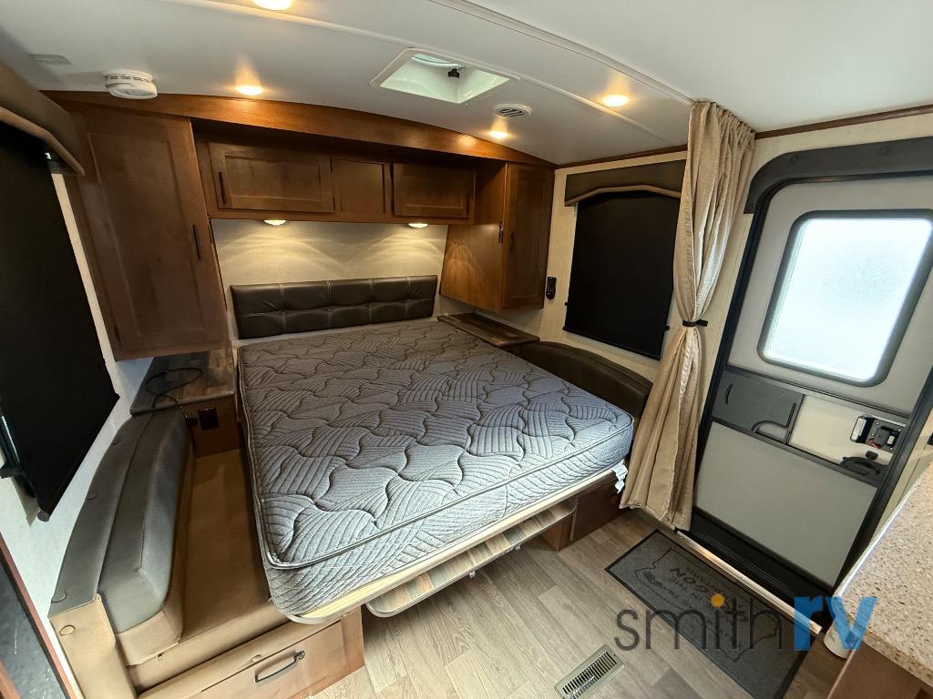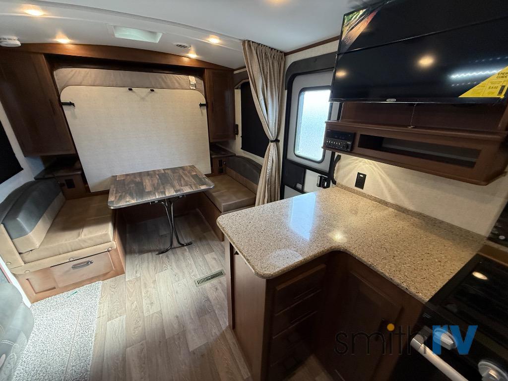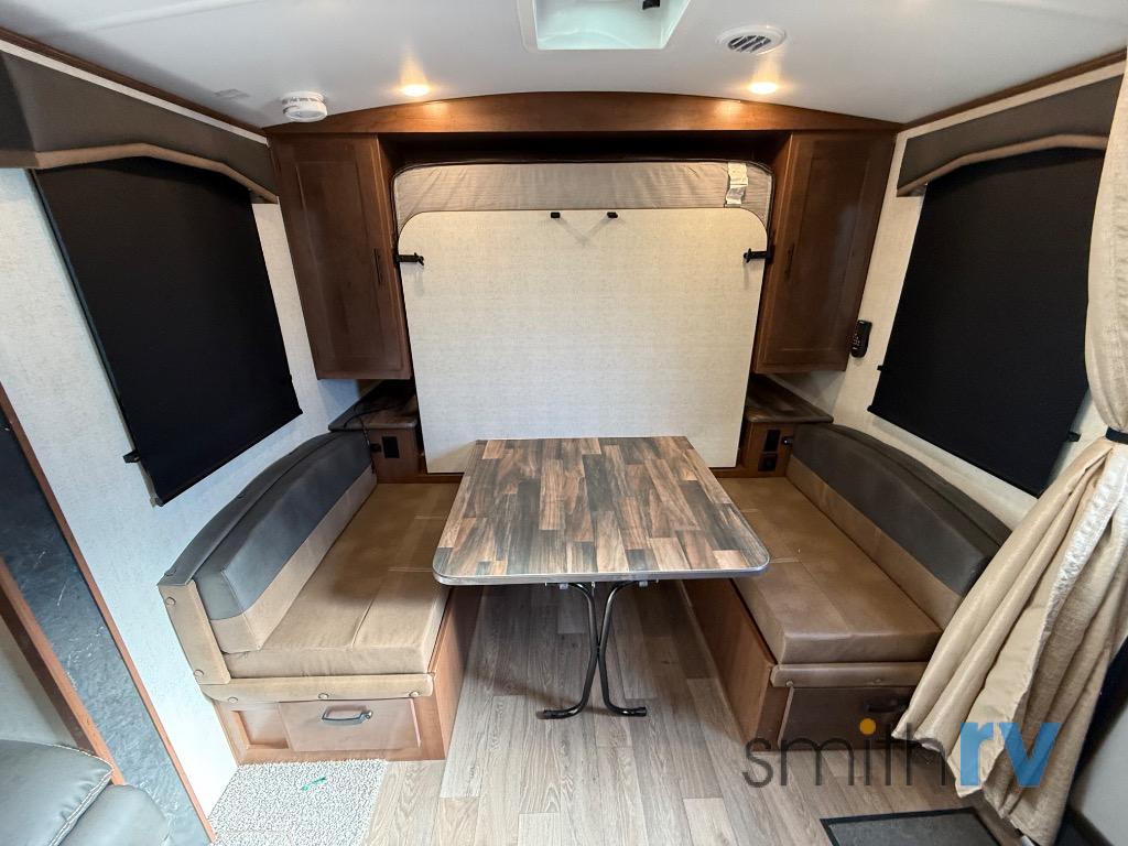 Versatility and comfort is found in this spacious travel trailer. There is a queen Murphy bed up front that can fold away into the wall so you can dine at the fold down booth dinette. The residential sofa with built-in recliners will be the perfect place to relax as you watch a movie on the swing out 32" TV, and the single slide out here will provide more interior space. This model includes a rear corner kitchen with plenty of counter space to prep meals and the full bath is in the other rear corner for privacy. You'll also enjoy the shower skylight for more head room, plus a living area skylight for more natural light.