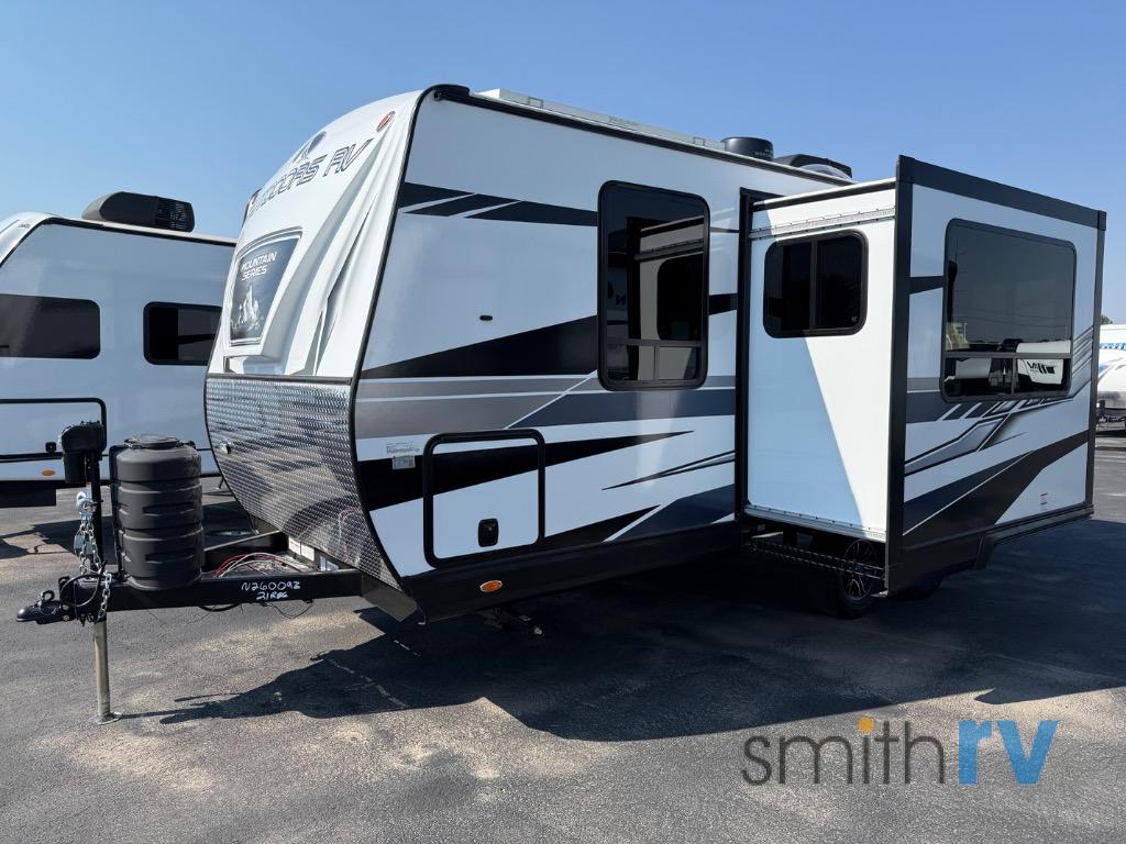 Camping in the mountains has never been more relaxing than in this single slide out travel trailer. You will have a full bath to clean up in each morning, and a three burner cooktop in the kitchen to prepare breakfast. The mountain dinette slide will be perfect for dining together, and if you have any overnight guests, they can sleep here. You will have the queen bed all to yourselves up front with dual bedroom wardrobes to keep your clothes tidy. This model also includes a 17' awning so you can visit outdoors protected from the elements.