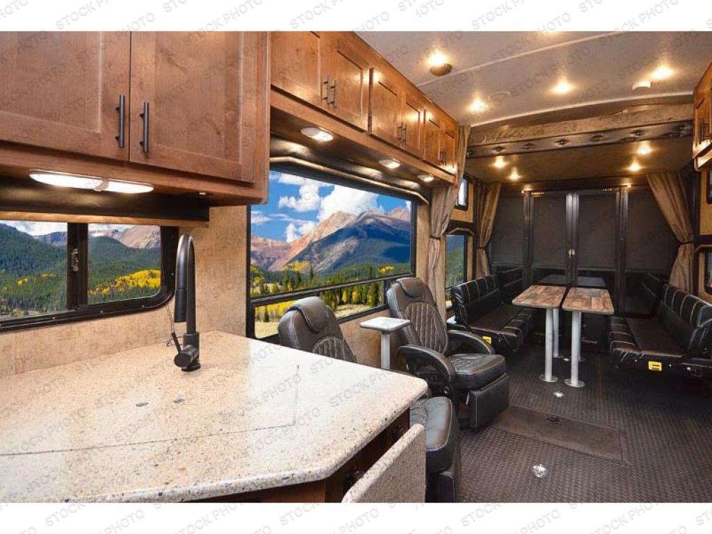 The kids will be begging you to go camping with this toy hauler! They can sleep on the loft queen bed in the 13' 4" garage area above dual opposing sofas with a table in between, and you can sleep comfortably in the front private bedroom with the queen bed. The bedroom also has an entrance into the dual entry bathroom which has a neo-angled shower with a skylight above for added natural lighting as you get ready. Keep everyone's bellies full with the fully equipped kitchen and entertained with the entertainment center that has a 32" swing out TV. Across from the entertainment center are two recliners to relax in each night too. The in-floor tool box makes life easier and the high pressure exterior spray washer is handy after trail riding through the mud!