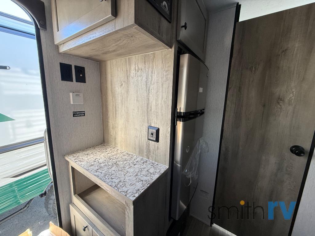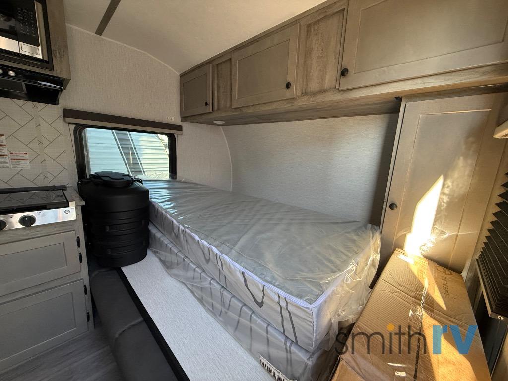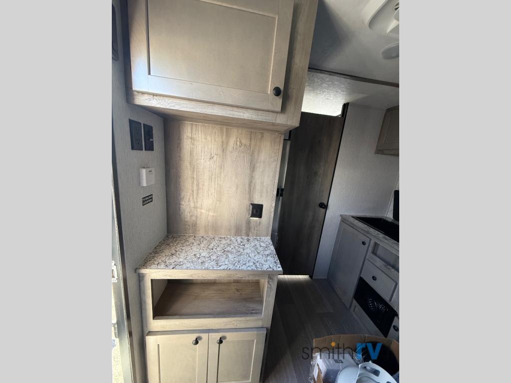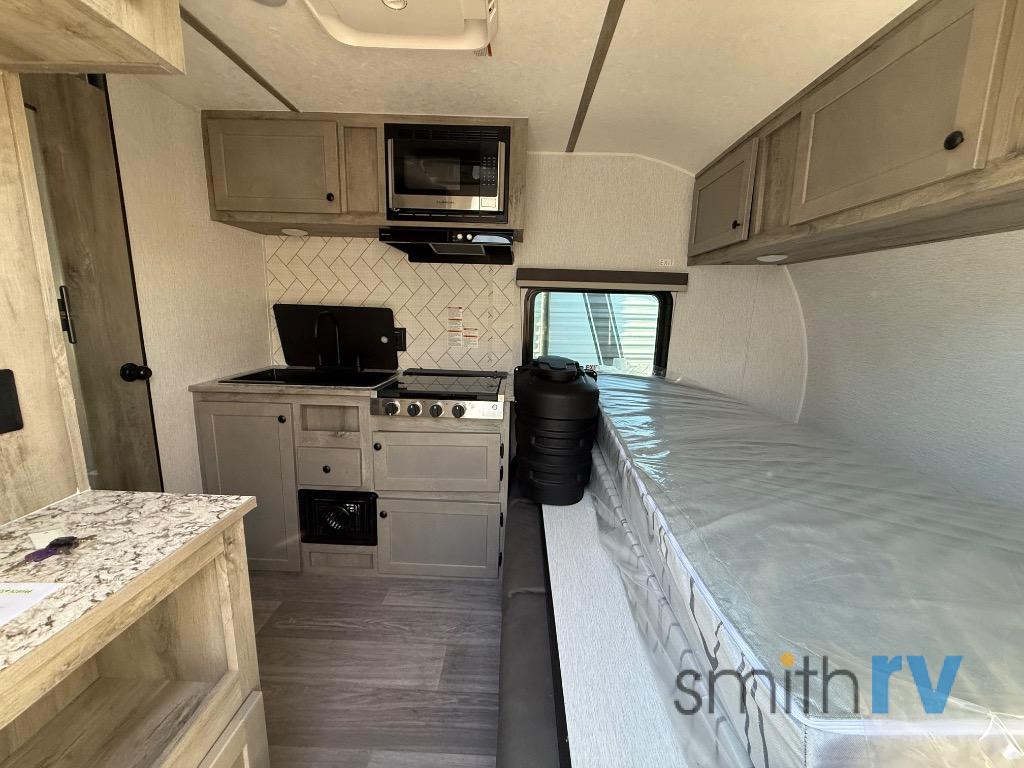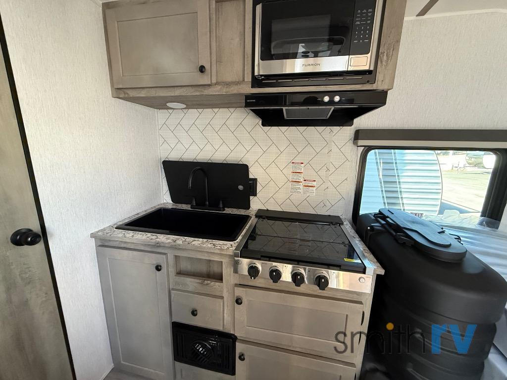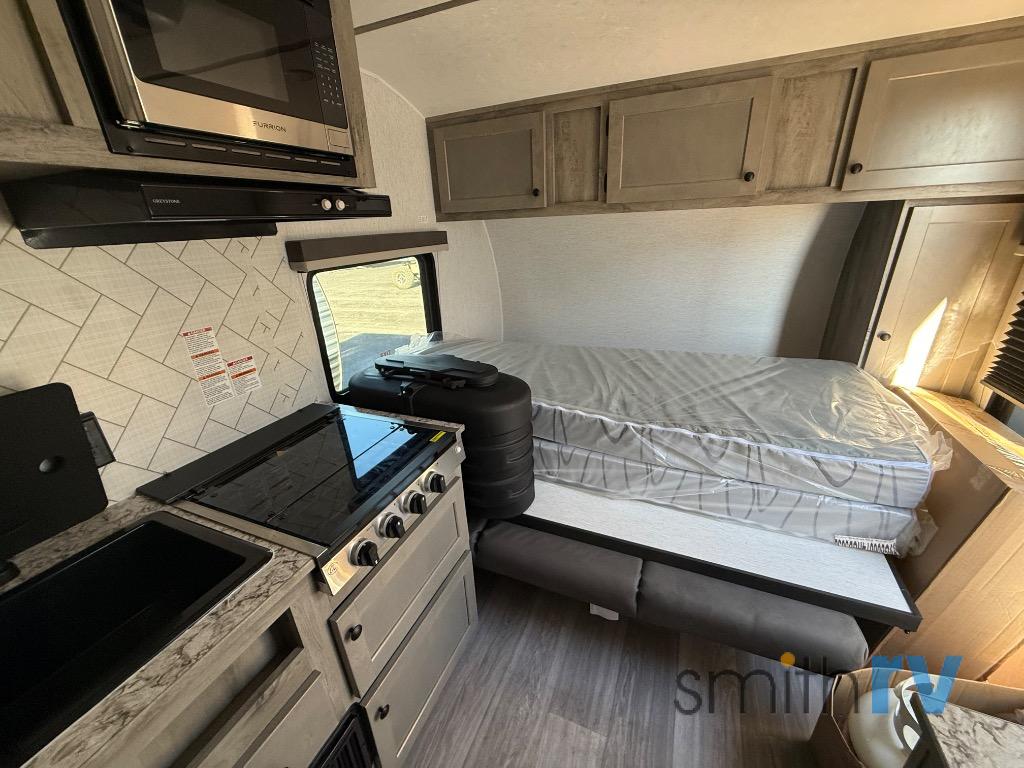 This compact travel trailer will be perfect for trips to the lake. Since there is a front Murphy bed, you won't have to sleep on an air mattress, and the convenient rear full bathroom lets you freshen up each day. Breakfast can be made on either the three burner cooktop, warmed up in the microwave oven, or even at the outside kitchen. When you're ready to wind down at night, you can grab a book and head to the sofa for a relaxing evening!