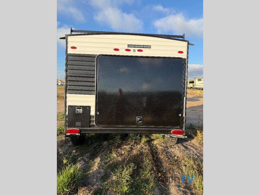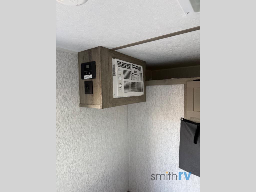 This unit is ideal for travelers seeking maneuverability and ease of towing without compromising on essential comforts. The rear closet provides convenient storage for clothing and personal items, keeping your belongings organized, and the bed assembly creates a cozy sleeping space, perfect for restful nights on the road. Practical storage and organization can be found in the front closet, which offers additional storage for travel essentials and personal belongings, while the front shelf delivers handy space for items you want within easy reach, enhancing convenience. Further, the A/C cabinet provides specialized storage for your air conditioning unit, ensuring efficient integration and protection. Convenience is met in the outdoor kitchen, which features a refrigerator, overhead cabinets, and a two-burner cooktop, providing versatile cooking options for preparing delicious meals outdoors.