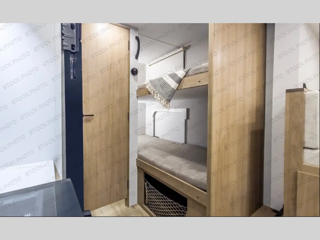 Get ready for a fun family weekend in the great outdoors with this trailer only steps away to enjoy inside comforts! The cook will love having everything to make warm meals and can easily store leftovers in the 10-cu. ft. 12V refrigerator, plus the flip-up counter gives them more space to prep or dry the dishes. The front 54" x 74" full bed has a divider curtain for privacy at night, and the rear corner 28" x 72" bunk beds are conveniently next to the private toilet and shower room. The booth dinette slide gives you a place to dine as well as sleep one more person, plus you will love the extra floor space that it provides. You might like to choose the optional jack knife sofa in its place; the option is yours!