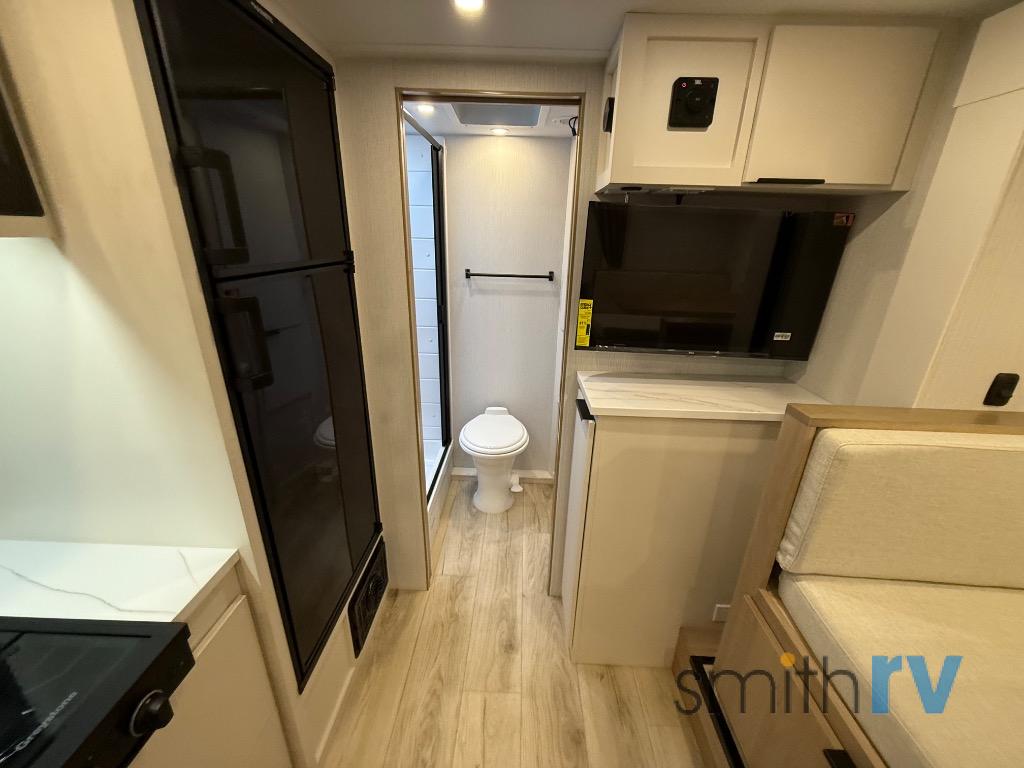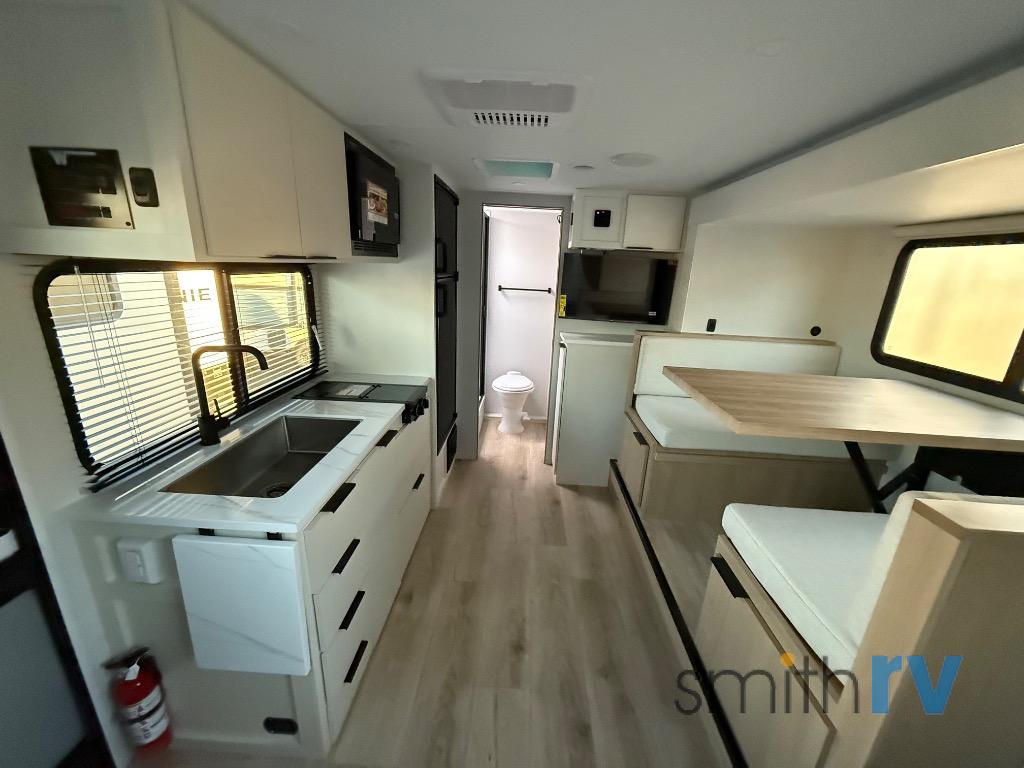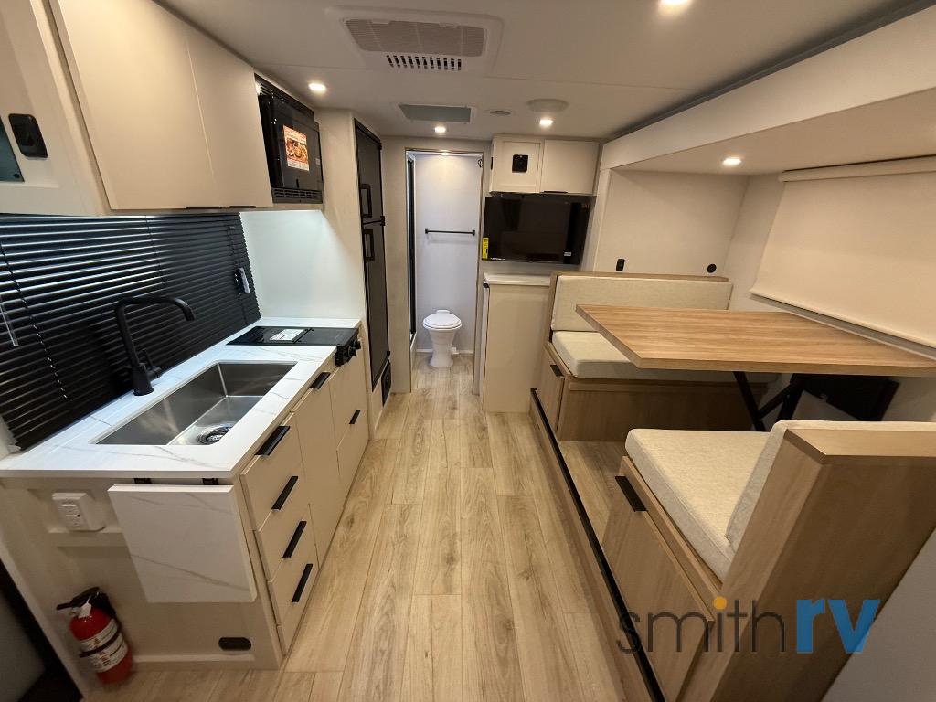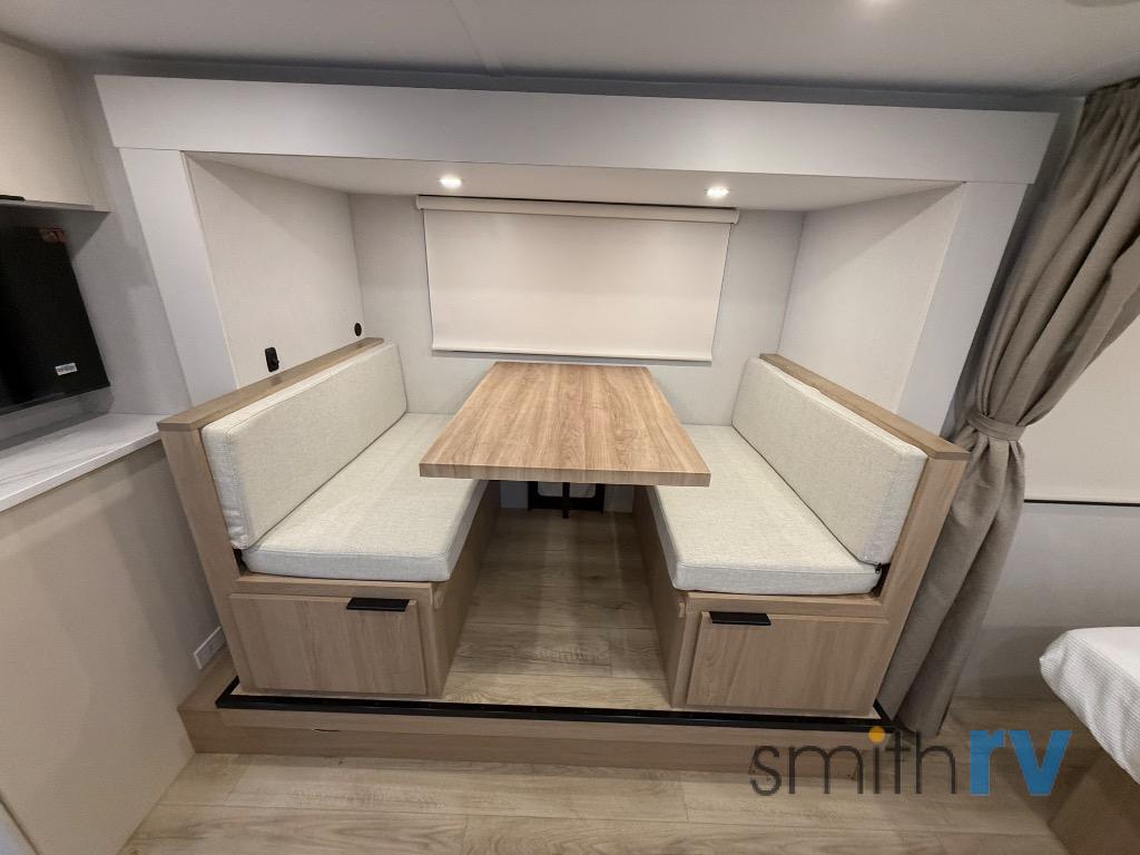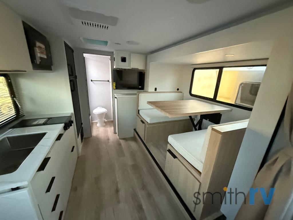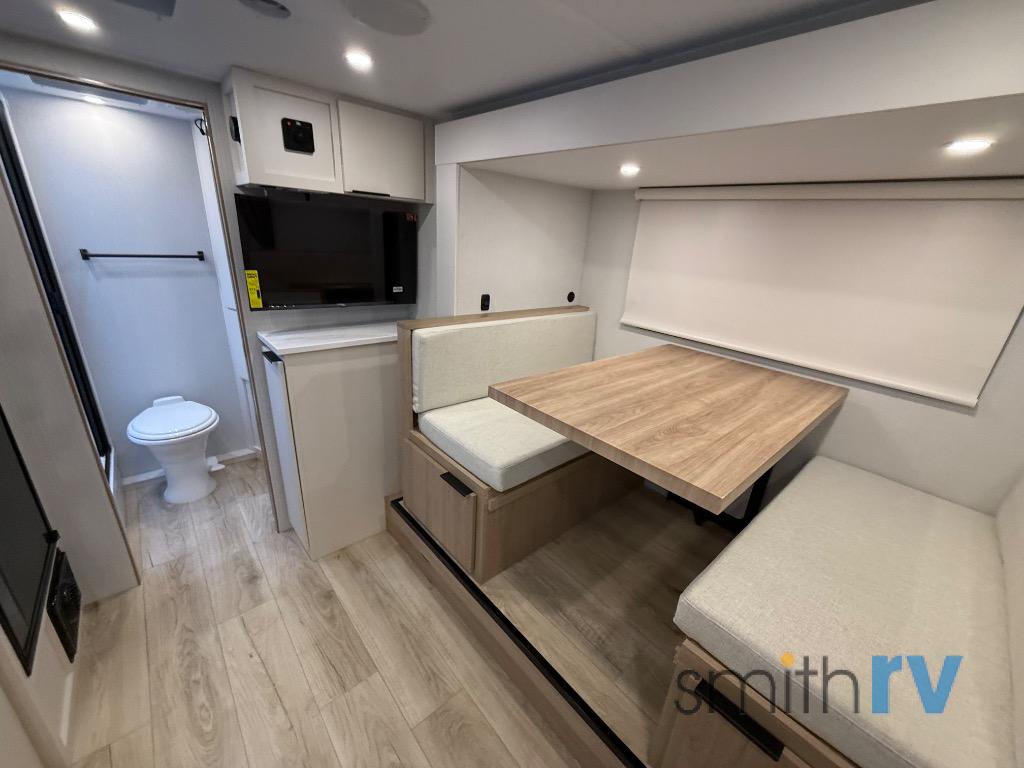Pack your bags and head to the campground with this travel trailer! You will love all that it has to offer from the full rear bathroom to the front 60" x 74" RV queen-size bed with dual wardrobes on either side of the bed. The 44" x 72" booth dinette slide is not only a great place to enjoy your meals at or play card games, but it can also be transformed into an extra sleeping space if you want to bring along a guest. When you don't feel like making dinner, you can easily pop in some leftovers or a bag of popcorn into the convection microwave and relax while you watch a movie on the Smart TV!