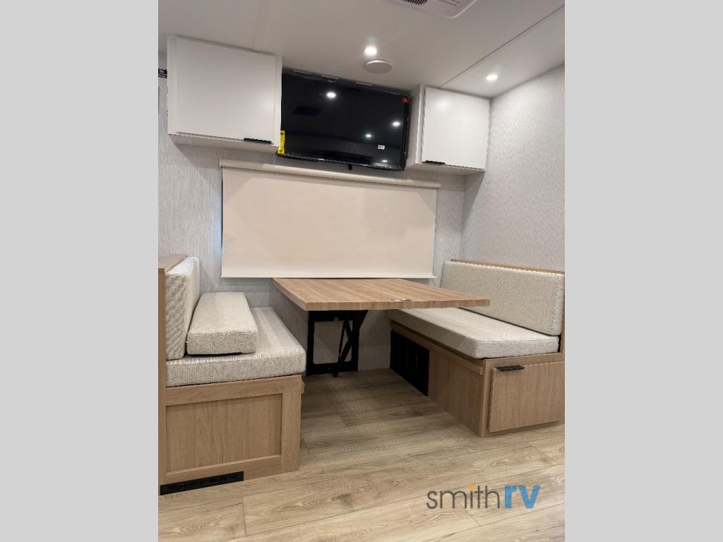 Have everything you need in a compact and well-equipped travel trailer. In the main area there is a large 42" x 82" U-shaped dinette with plenty of room to enjoy a meal, games or sharing stories. Across there is theater seating located in the slide-out that adds extra comfort and seating space. You can enjoy cooking every day from a quick pancake to your favorite casserole in the cooktop with oven and store leftovers in the 10.6 cu. ft. refrigerator. Moving forward you'll find convenient storage options such as the pantry with removable shelves. In the front you'll find a spacious 66" x 80" Olympic queen bed, on each side wardrobes for more storage.