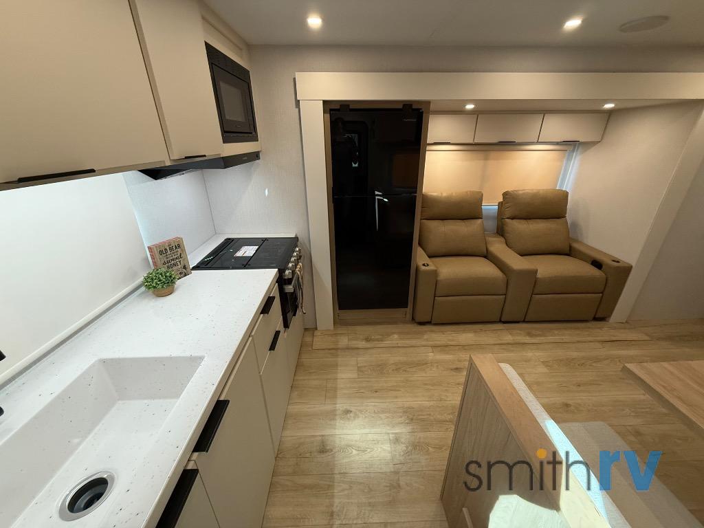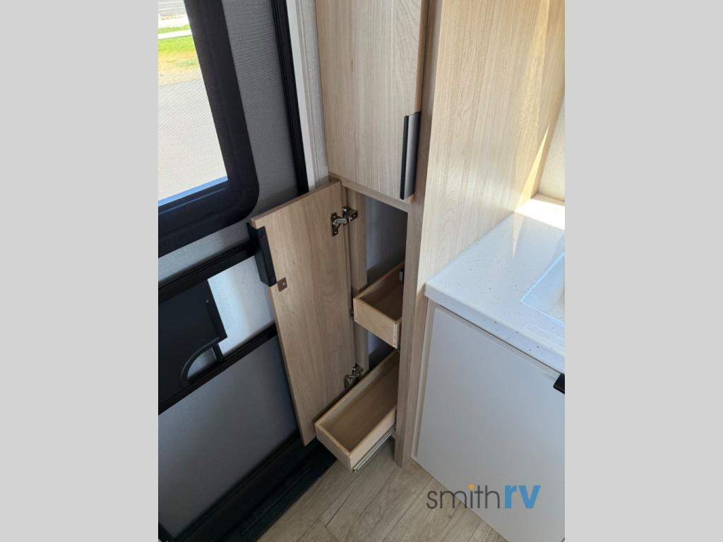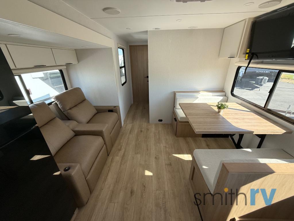 This travel trailer provides both comfort and convenience. At the front, you'll find a private bedroom with its own exterior entry for added privacy and ease of access. The middle bathroom ensures convenient access from all areas and includes a wardrobe with washer and dryer prep. In the main living space, a spacious 42" x 82" Mega Dinette provides a great spot for meals, games, or work, while theater seating across from the TV allows for relaxing evenings. At the rear, the fully equipped kitchen includes a cooktop with oven, a refrigerator, and a pantry with pull-out shelves for maximum storage and organization. A second exterior exit from the kitchen area adds extra convenience, providing both a comfortable and functional trailer.