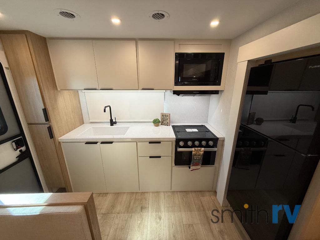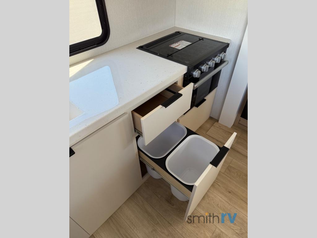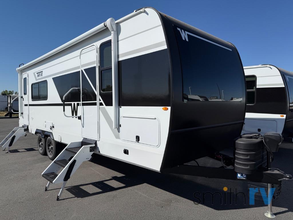 With any Thrive travel trailer by Winnebago, you can camp with functionality, comfort, and convenience! The large front viewing window with strike guard will be the first thing that catches your eye, and the fiberglass sidewalls with Azdel Onboard provide a durable trailer made to last. There is also an exterior ladder, along with front radius profile lights, power stabilizer jacks, and a powered awning with LED lighting to name a few exterior features. You will stay powered up by the 30-amp power cord and 200-watt solar panel, plus there is a tankless water heater for endless hot showers. Inside, you'll love the custom Winnebago furniture, carpetless side outs, molded fiberglass countertops, and residential recessed ceiling lights to keep your space well lit!