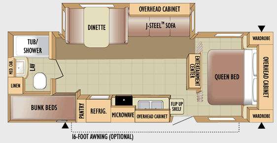 Single Slide Jay Flight, Rear Bathroom, Tub/Shower, Lav, Toilet, BunkBeds, Pantry, Refrigerator, Microwave, 3 Burner Range, Double Kitchen Sink, Slide Out Booth Dinette & J-Steel Sofa, Ent. Center, Front Bedroom w/Queen Bed, Dbl. Chests & Wardrobes, Flip-Up Shelf, Pass Thru Storage and More.