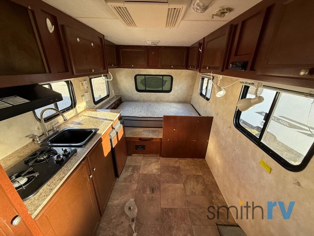 Inside, the 17FB features a popular floorplan centered around a front queen island-style bed, allowing for walk-around access, which is often rare in this size class. The interior typically includes a kitchenette with a two-burner cooktop, microwave, and refrigerator, along with a booth dinette that converts for extra sleeping space. A rear or side wet/dry bath (depending on specific sub-model variations) provides essential amenities, ensuring a comfortable, self-contained, and affordable camping experience