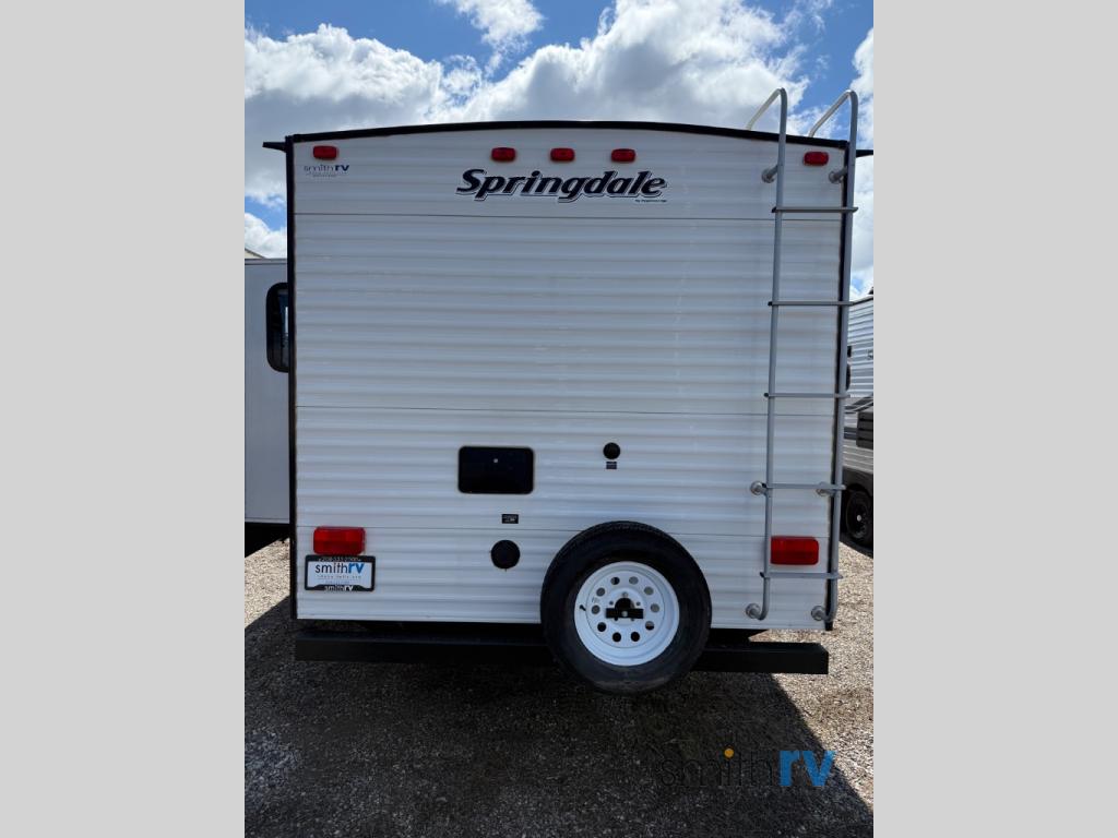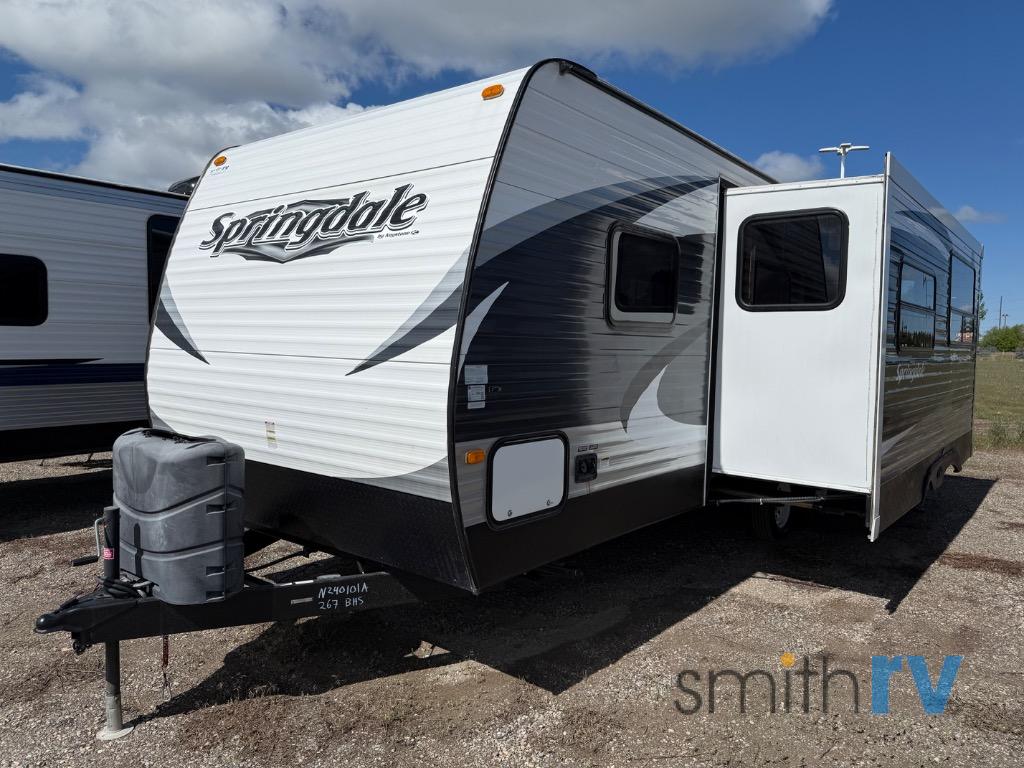 A rear set of bunks, rear bath, and large single slide provide a spacious way to travel in this Keystone Springdale 267BHSEWE travel trailer.