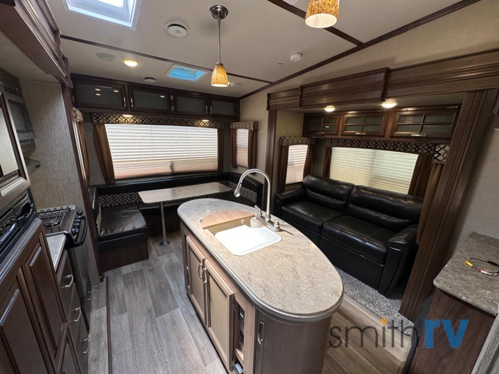 As you enter you will see a large pantry and entertainment center straight ahead. Next there is a slide out sofa with overhead storage. On the opposite side as the dinette find a slide out refrigerator, three burner range, and microwave. Plus there is a center kitchen island with a double sink for easy clean up. You are sure to enjoy the u-shaped dinette along the rear wall during meal time or even at night for additional sleeping space.