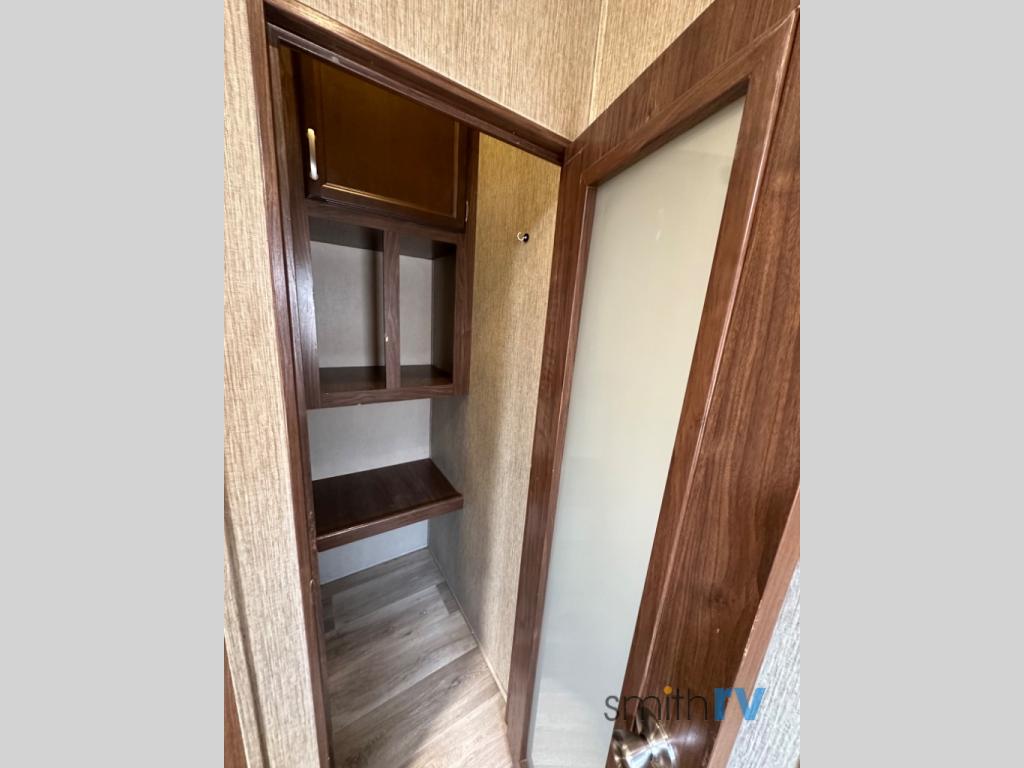 Heading towards the front, the side aisle bath includes a shower, toilet, sink with medicine cabinet, and linen storage in the bedroom slide out. Plus there is a convenient second entry from the bedroom.