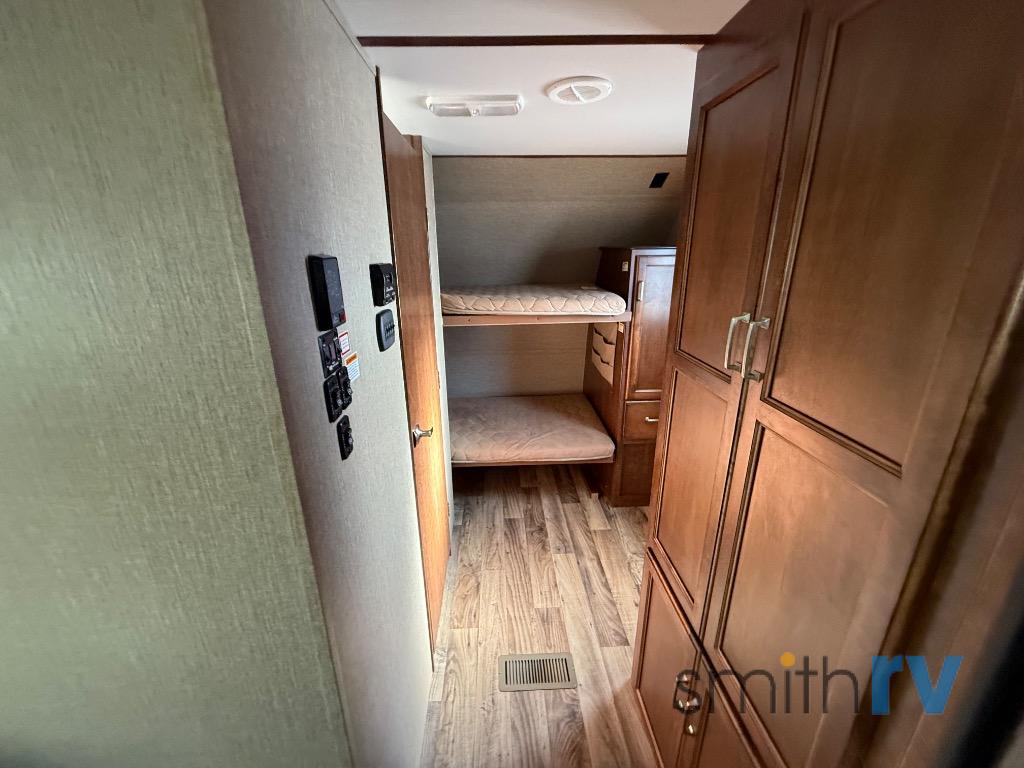 As you enter through the main entry door, to your right there is a wardrobe and a set of front flip down bunk beds.