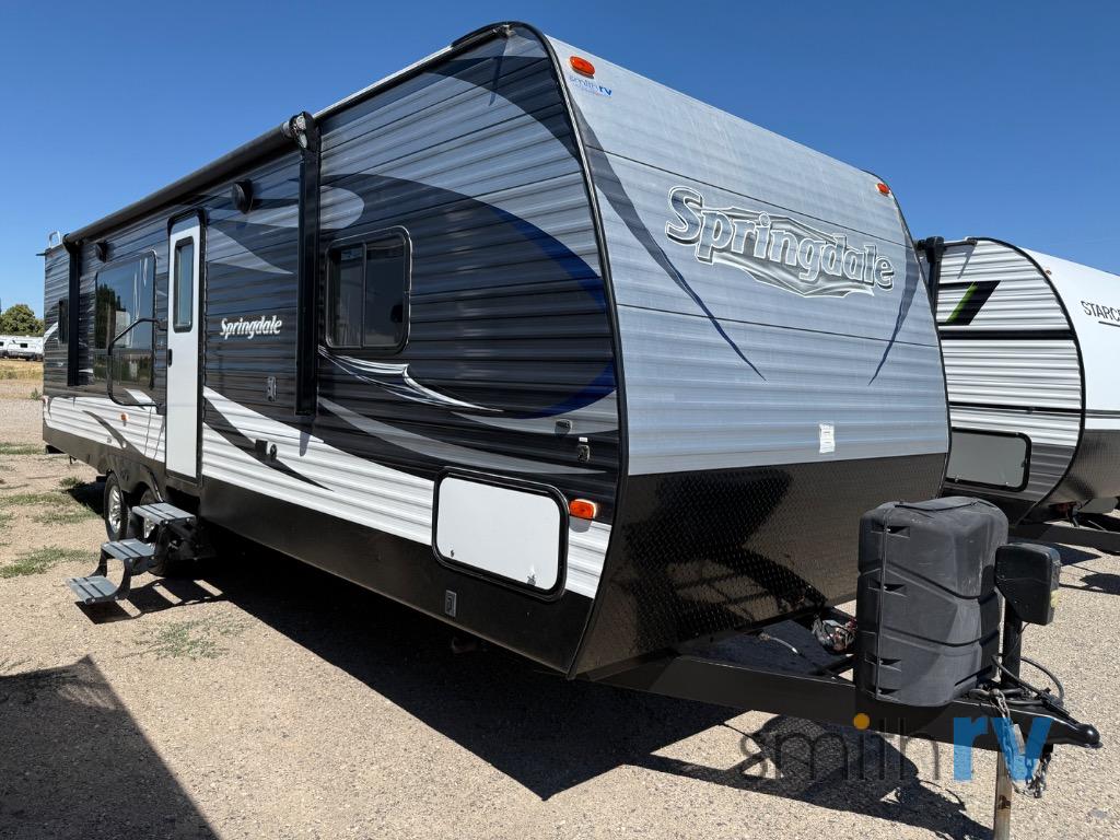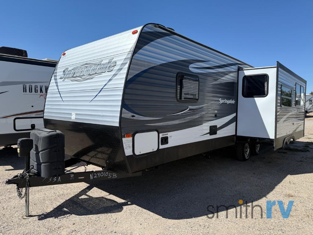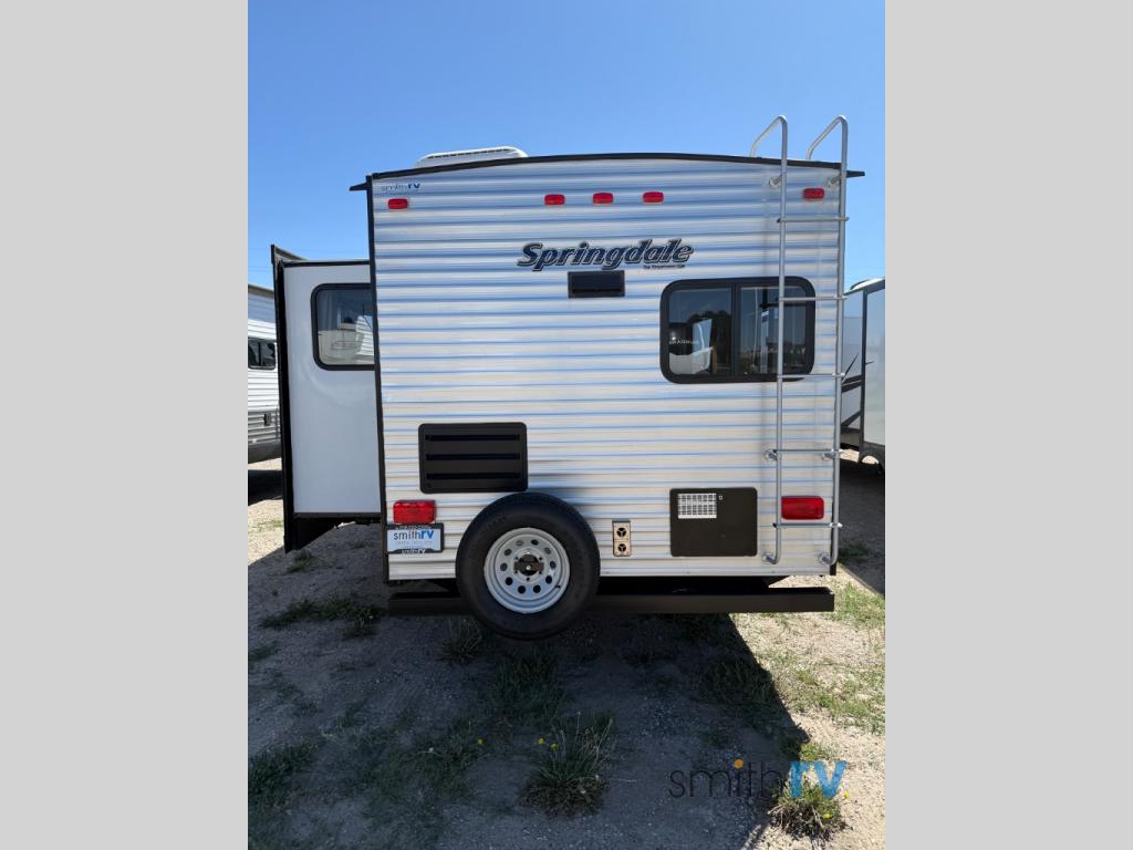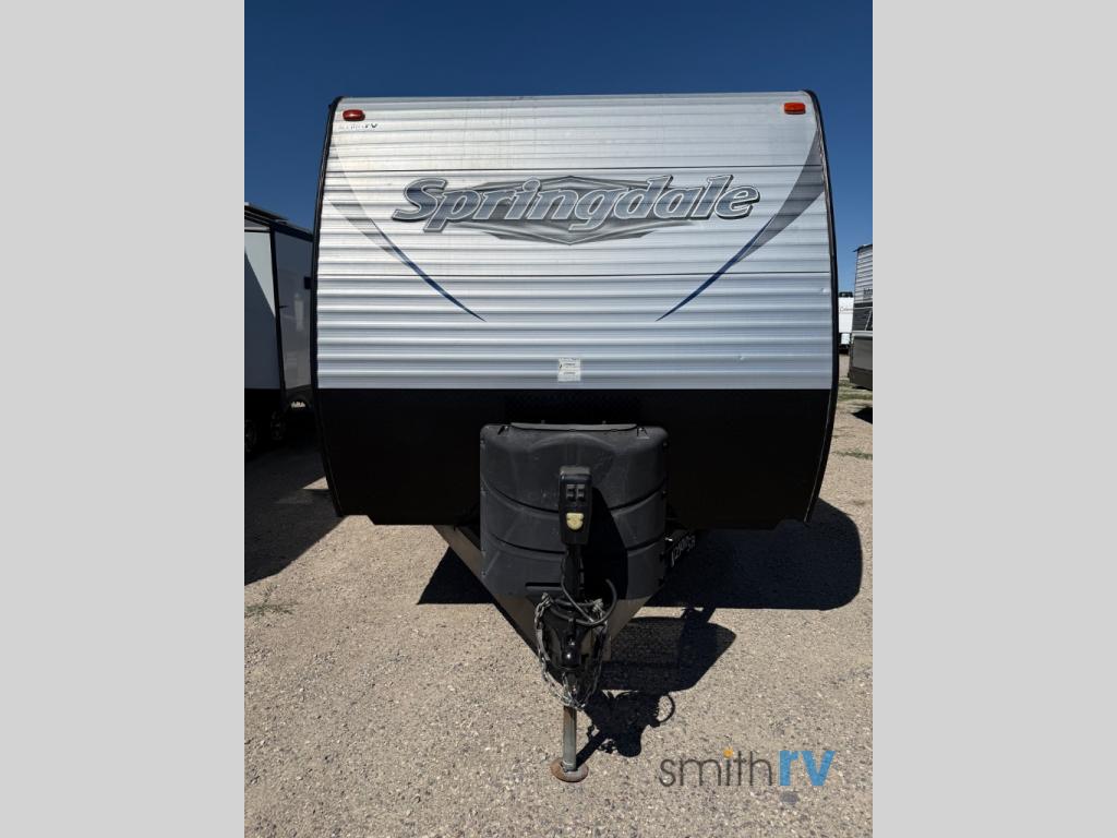 This Keystone Springdale travel trailer features a rear kitchen, large single slide in the living room, a walk-through bath, and a front bedroom.
