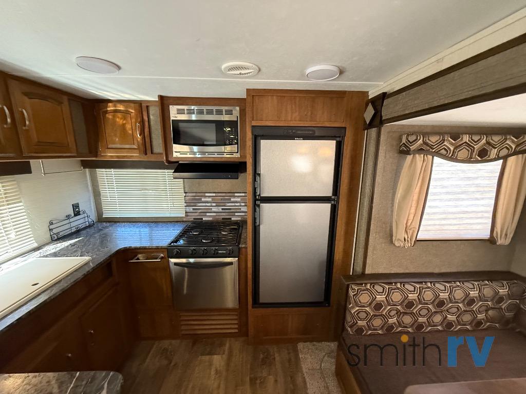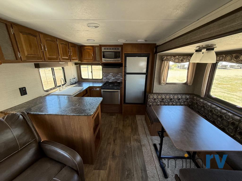 Enter model 293RKWE and find a wide open spacious living area with a slide out tri-fold sofa including overhead storage, plus a large u-shaped dinette. Both offer plenty of seating, and can quickly become additional sleeping space at night. There are two additional lounge chairs opposite the slide to the left of the entry door. Between the chairs find an end table, and the overhead cabinets stretch all the way back to the rear corner where they continue across the rear until the range. A nearby entertainment center can easily be seen from any seating in the room.