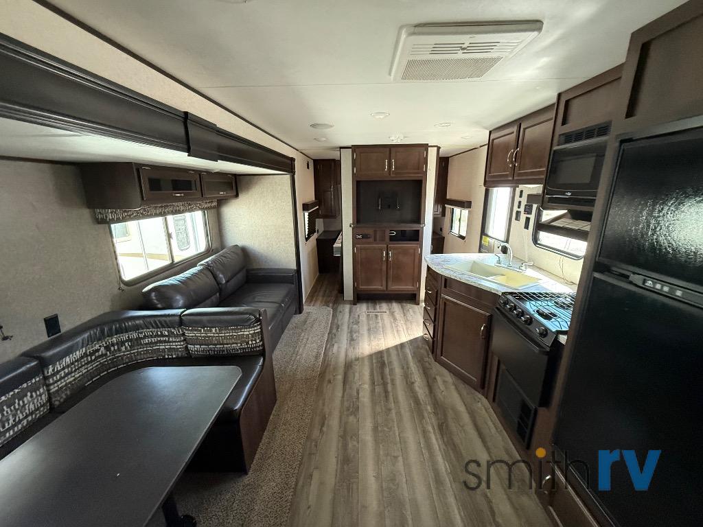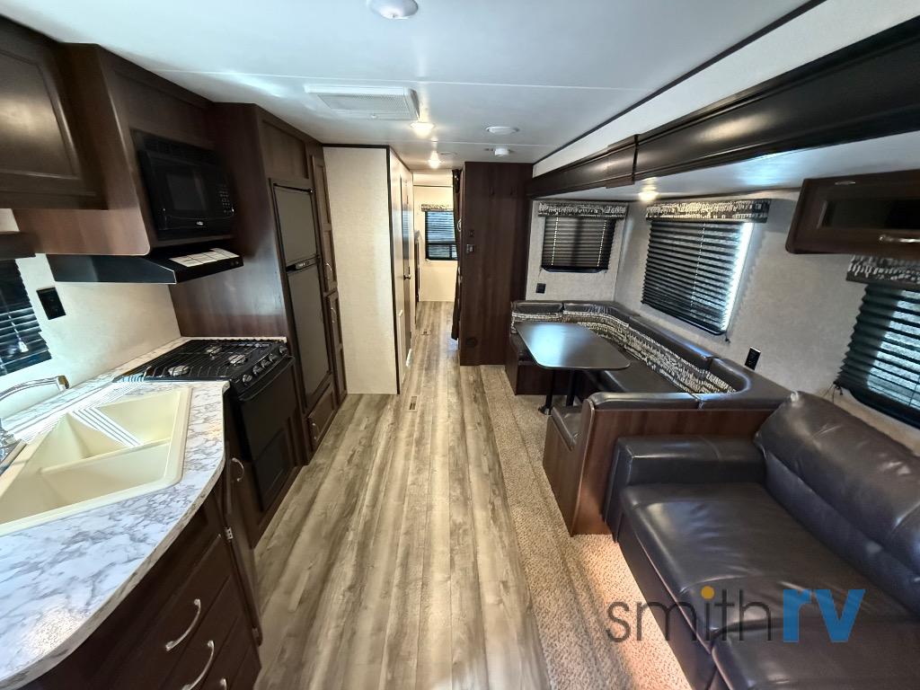As you enter the travel trailer, to the left you will find an angled double kitchen sink, three burner range, microwave, refrigerator, and pantry. The opposite side of the trailer has a slide with a u-dinette, and sofa or an optional hide-a-bed sofa with overhead cabinets. Along the center interior wall there is an entertainment center which can easily be viewed from anywhere in this combined kitchen/living area.
