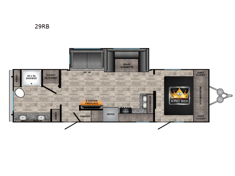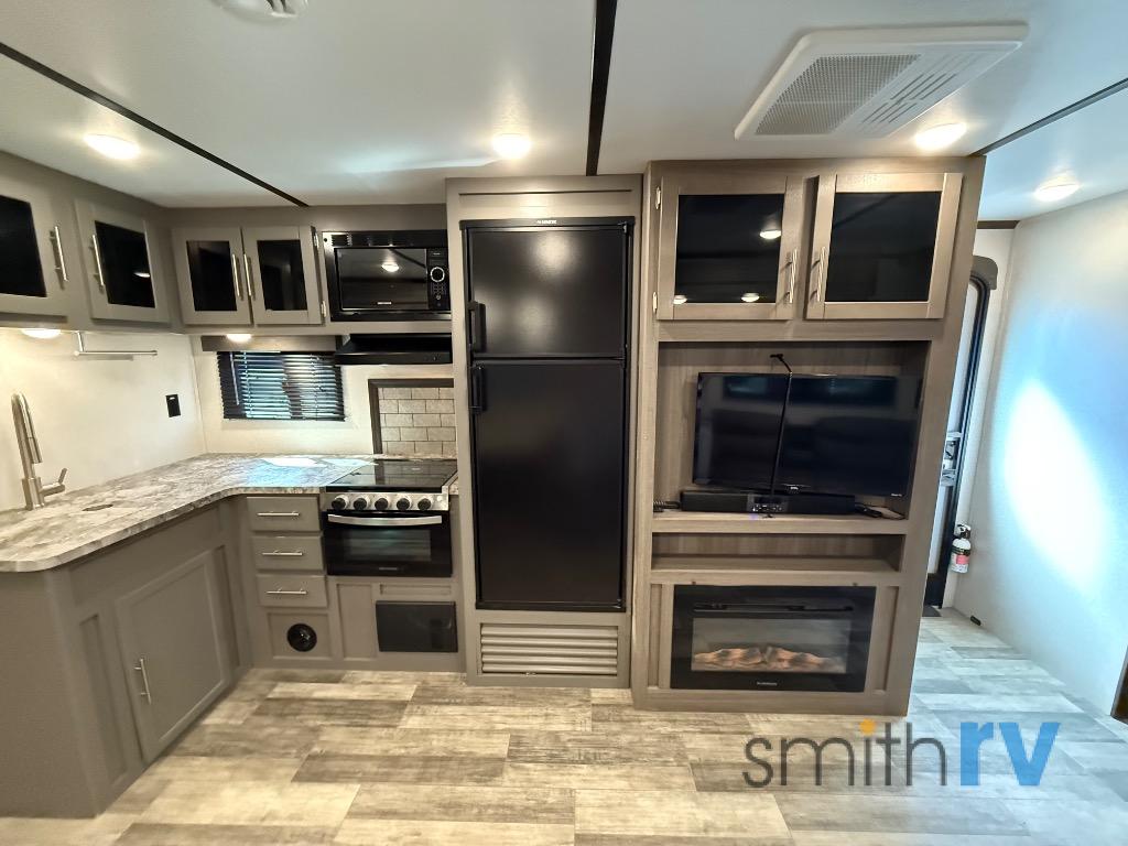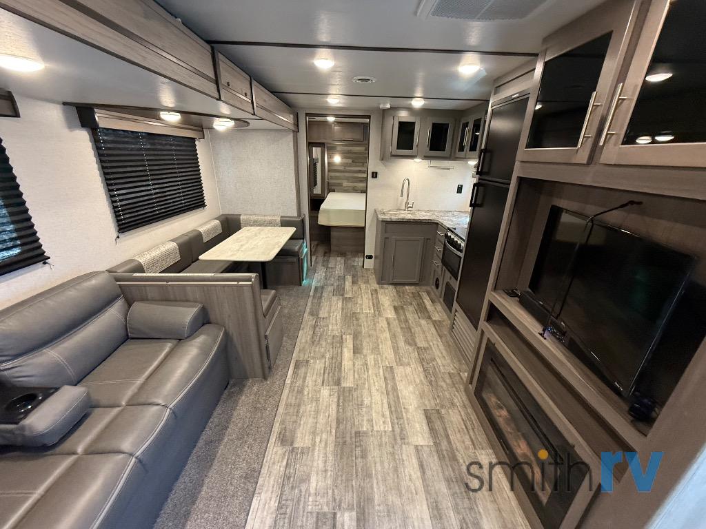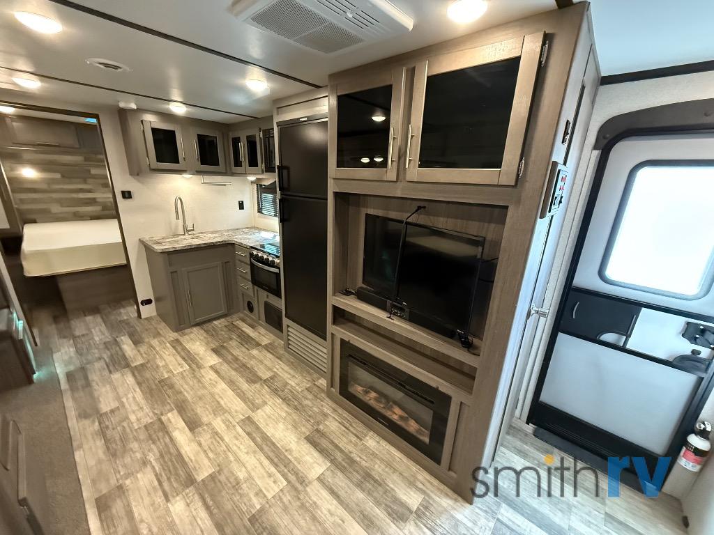 One look at this dual entry travel trailer and you will fall in love. The little ones can play with the dog on the floor thanks to the extra interior space provided by the large slide out. Here, your group can dine around the U-shaped dinette and relax on the 60" jackknife sofa, and the fireplace will give that special touch-of-home. The spacious full rear bath features a 30" x 36" shower, dual bath sinks, plus a closet that has been prepped to add an optional washer and dryer if you choose. Head to the front private bedroom where you can hang your clothes in the dual shirt closets, and get a great night's rest on the king bed. You even have your own exterior entrance door so that you can sneak out to your lawn chairs after everyone is asleep!