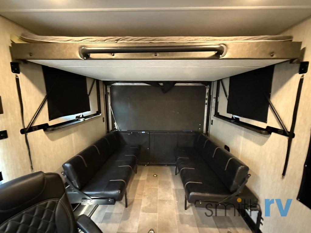 Bring along your kayaks, dirt bikes, or even a side-by-side in this toy hauler. There is 15' 10" total garage space, and a ramp door for easy unloading. Once your toys are out, enjoy lunch at the roll-over sofas, or let your guests rest on the quick set queen bed system before heading out. There is a dual entry bath to clean up in each day, and the Rogue king bed is sure to bring sweet dreams. In the morning, prepare eggs and bacon on the three burner cooktop, and the milk can go back in the 10.1 cu. ft. residential refrigerator. This model also includes a flip-up sofa for more seating and sleeping space, and you can add the optional lounge chairs too!