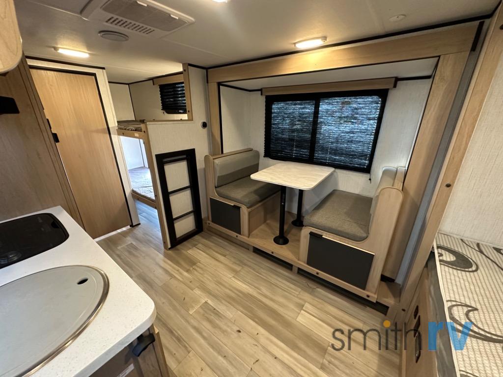 Pack your bags and hitch up this travel trailer for a fun family vacation! The kids can sleep on the set of double bunk beds and you can sleep on the front queen bed with drawers underneath to store your necessities. The booth dinette slide not only opens up the living area, but also transforms into an extra sleeping space when you aren't using it to enjoy a meal prepared with the two burner cooktop and 5 cu. ft. refrigerator. Everyone can stay squeaky clean with the shower in the rear corner bathroom. Don't leave any outdoor gear behind when you have a front exterior full pass-through storage area for it all!