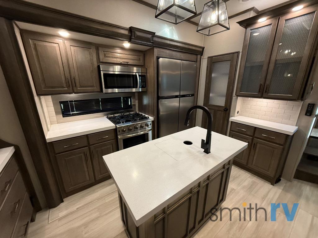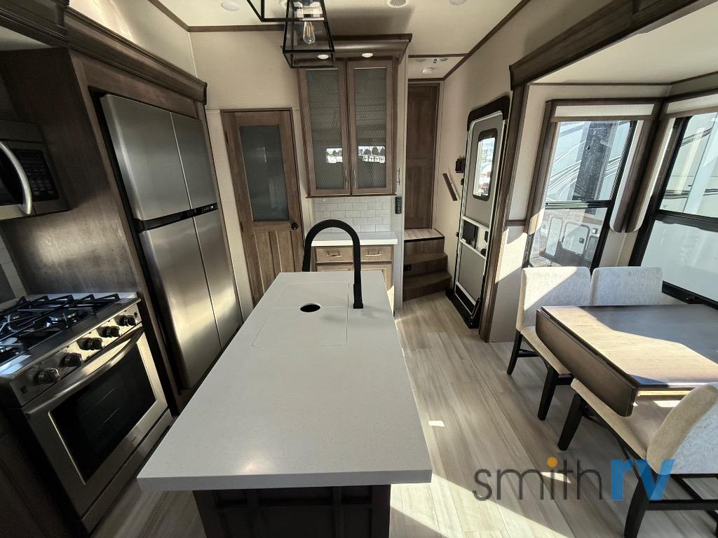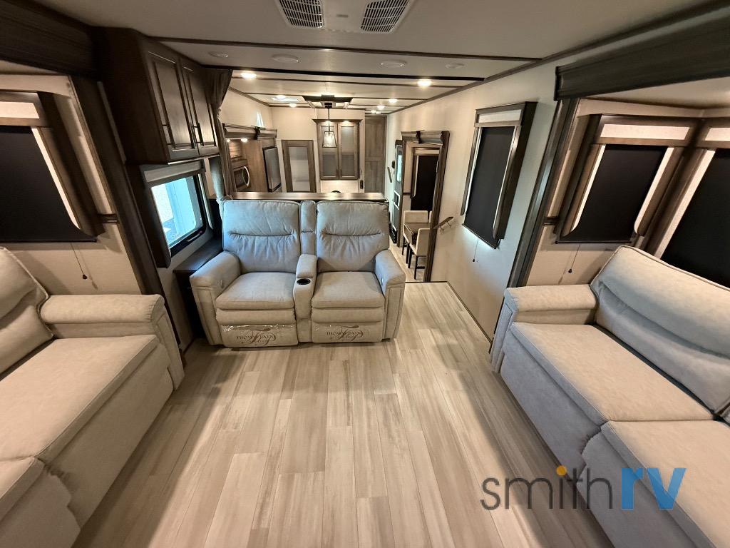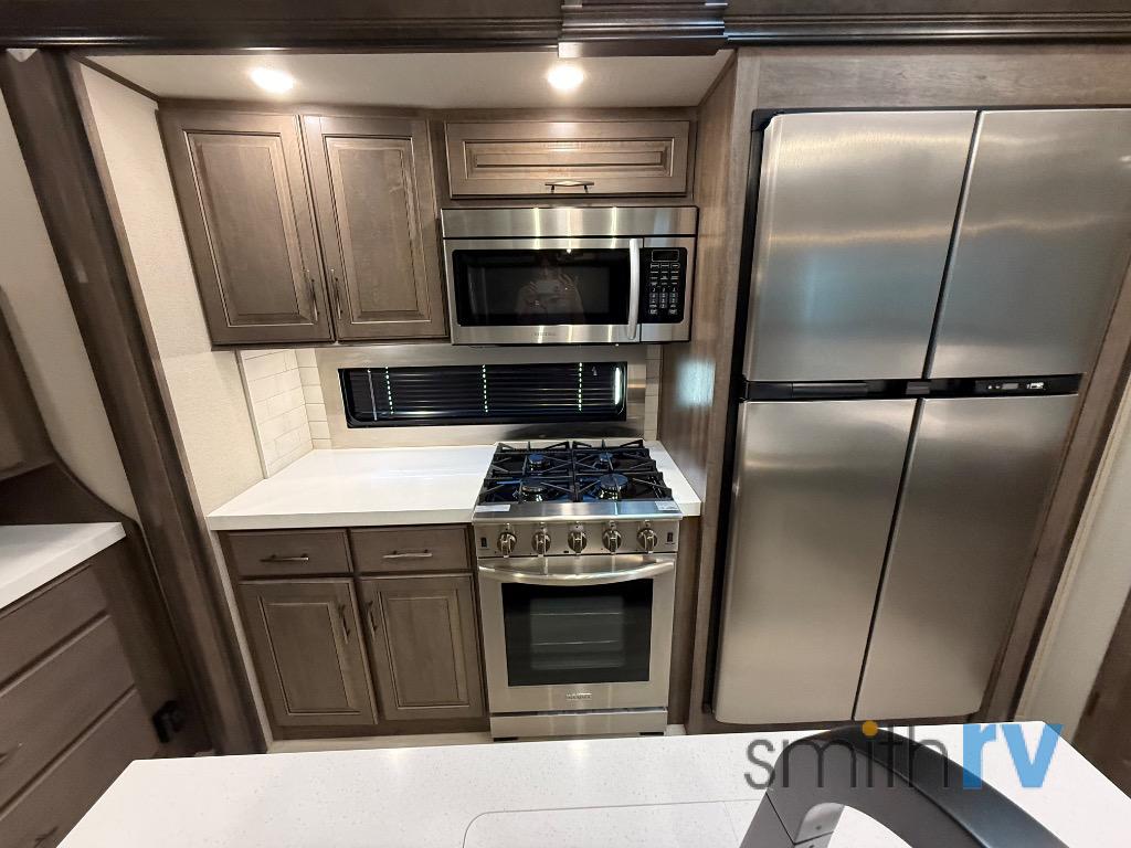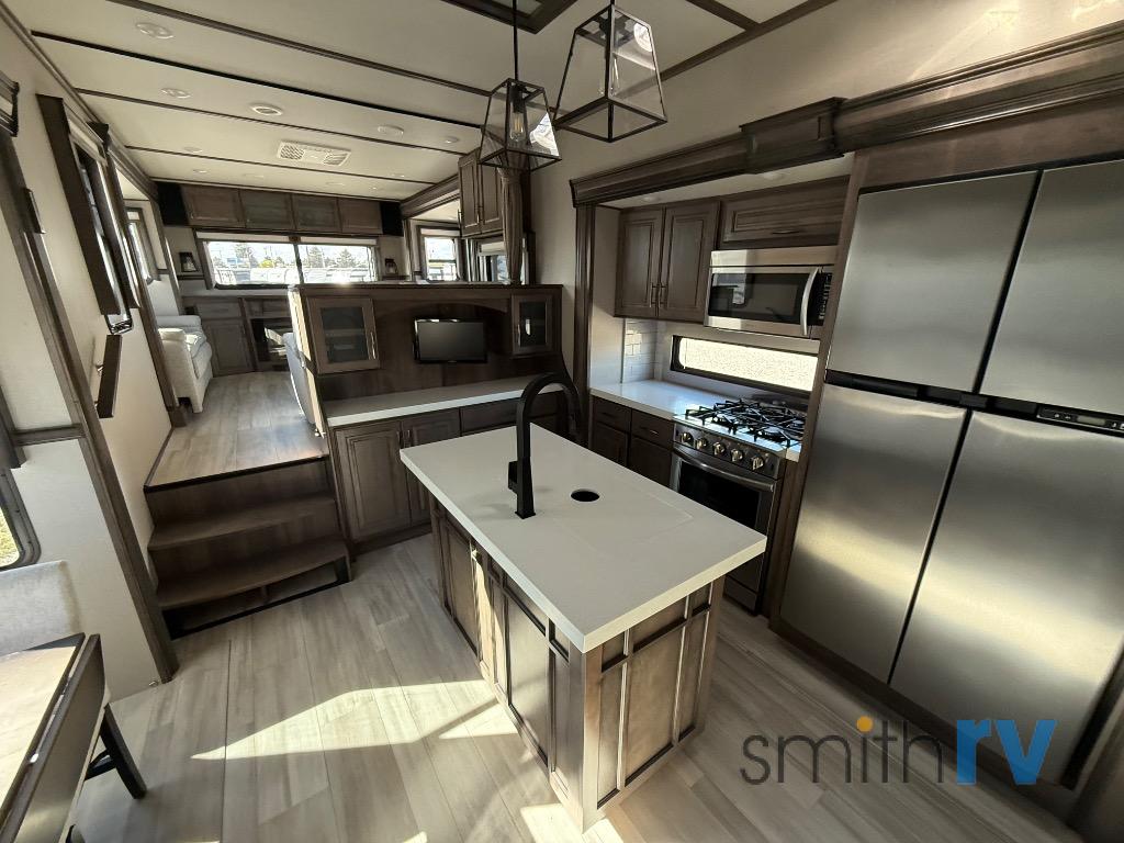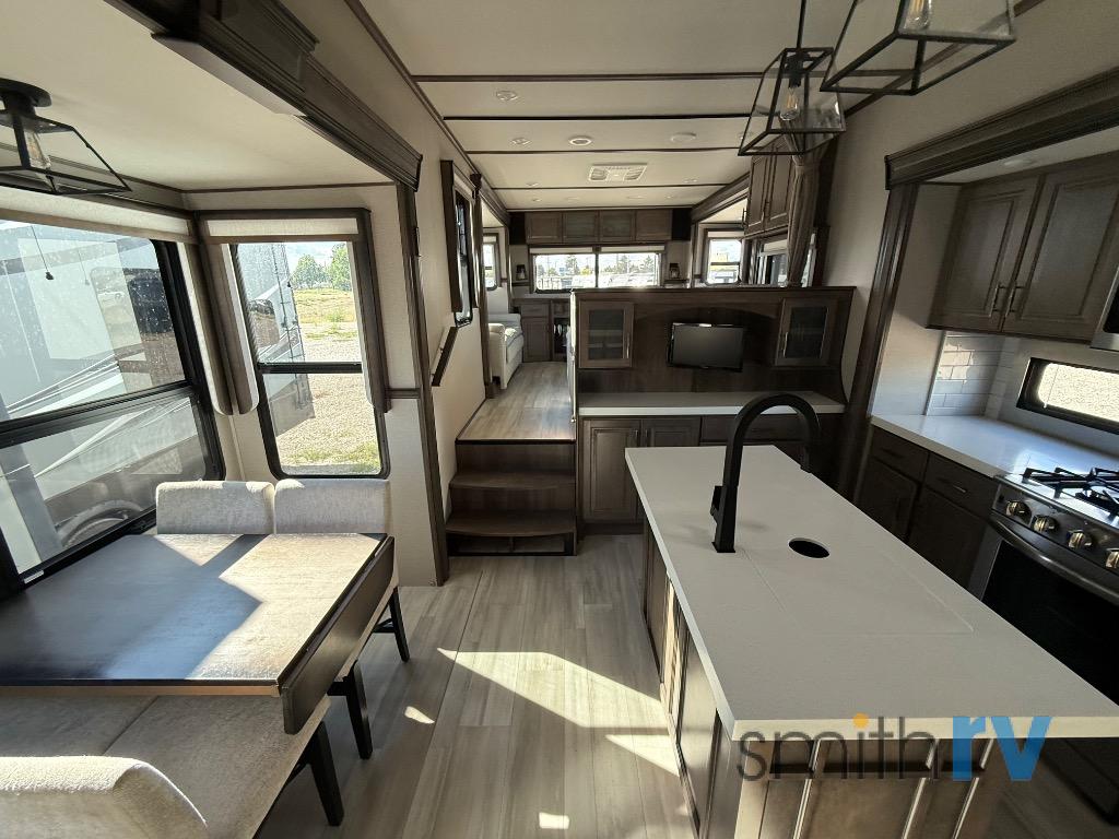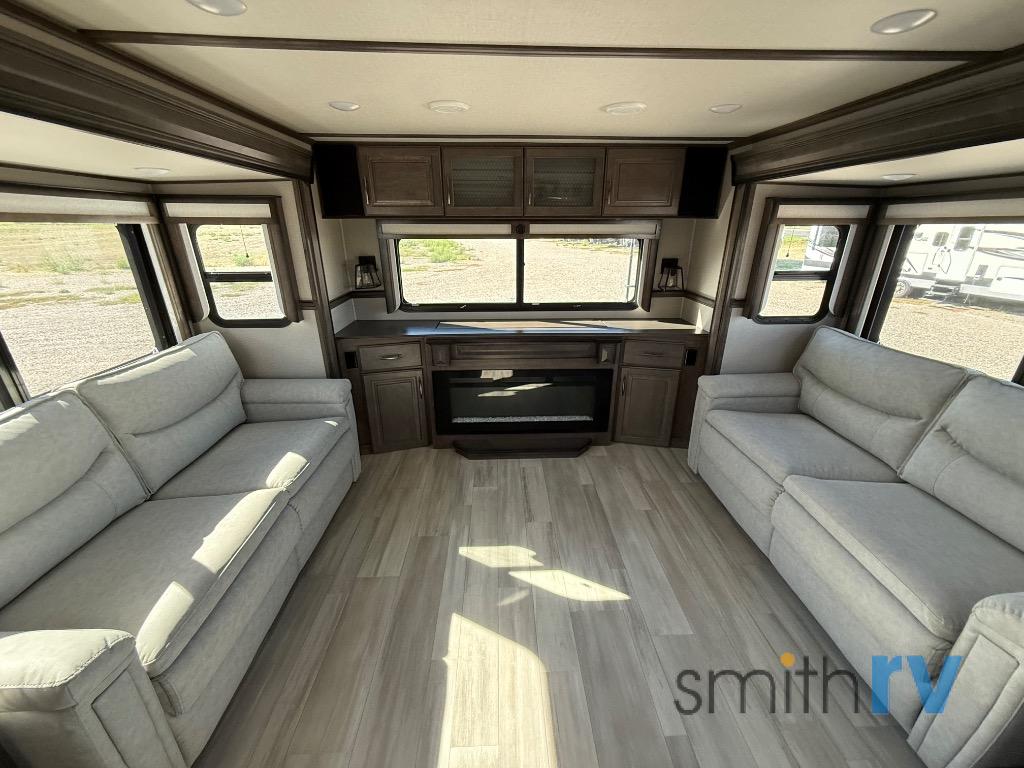 Your extended stays at any location will be enjoyable in this fifth wheel with the separate rooms, the five slide outs and the storage found inside as well as outside! The exterior rear storage with sliding tray is super handy to carry the larger camping items and totes plus there are several other compartments for items such as charcoal, outdoor games, hiking boots, fishing gear and more. The separate rear entertainment and living area provides an LED TV with fireplace below, several windows for great views, furniture to relax on as well as sleep on, plus USB charging outlets for your cellphones and such. The middle kitchen offers a buffet, a hutch, an oversized pantry, stainless steel appliances, and a free-standing dinette slide out with more views out of the windows. The full bathroom is up a few steps and before you reach the front bedroom. You will love the seated shower and linen storage. The bedroom provides a queen bed slide, a pull-out ottoman, a flip-up dresser with LED TV, and a mirrored wardrobe. There are a few more options to add if you wish such as a washer/dryer, an outside pull-out kitchen, and/or a Solitude solar system.