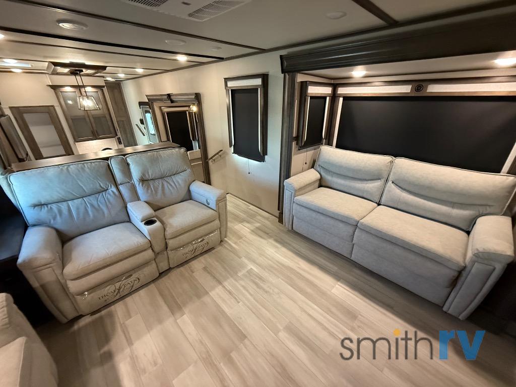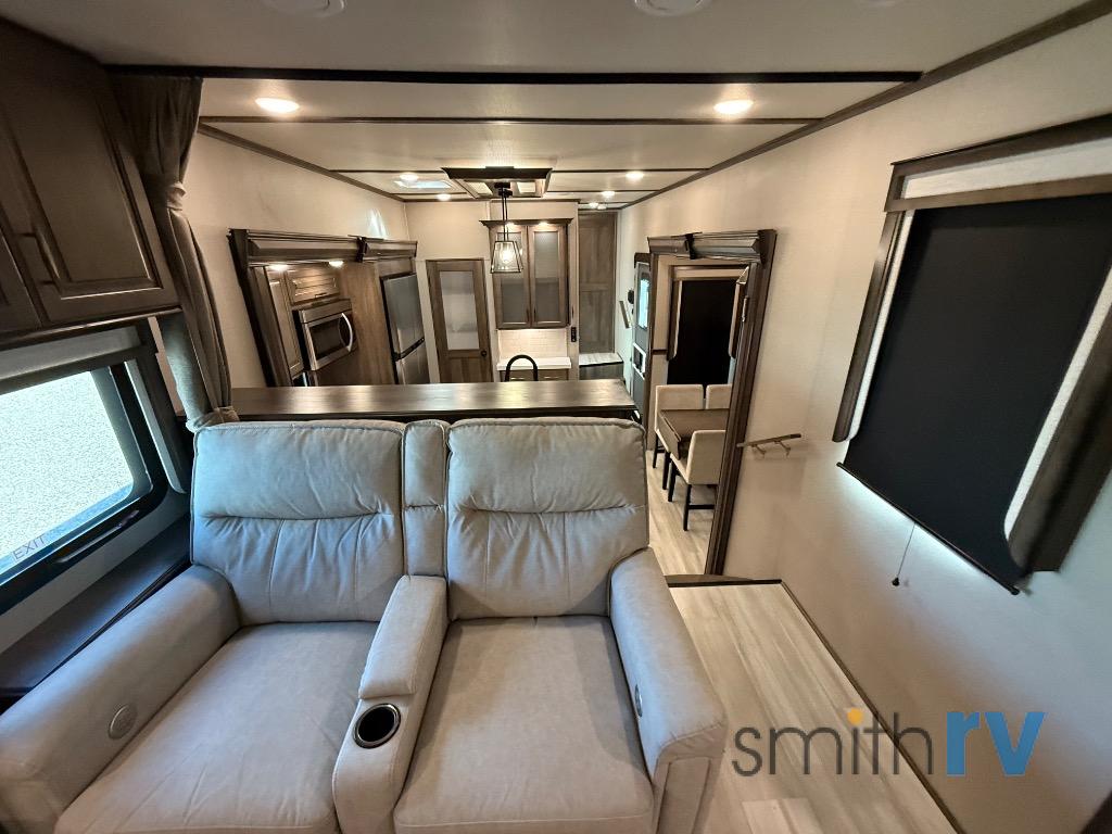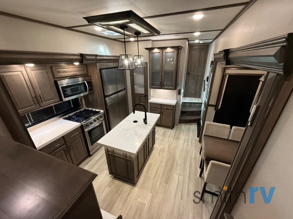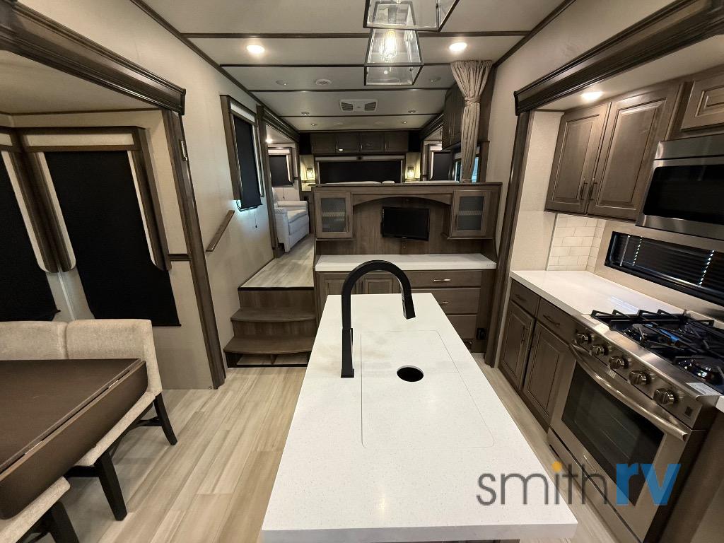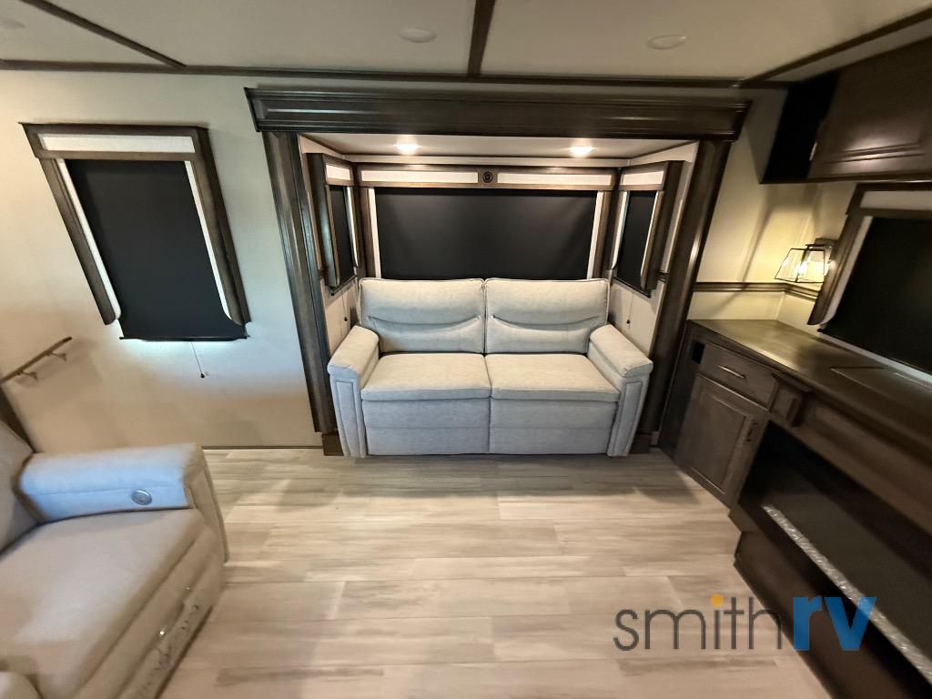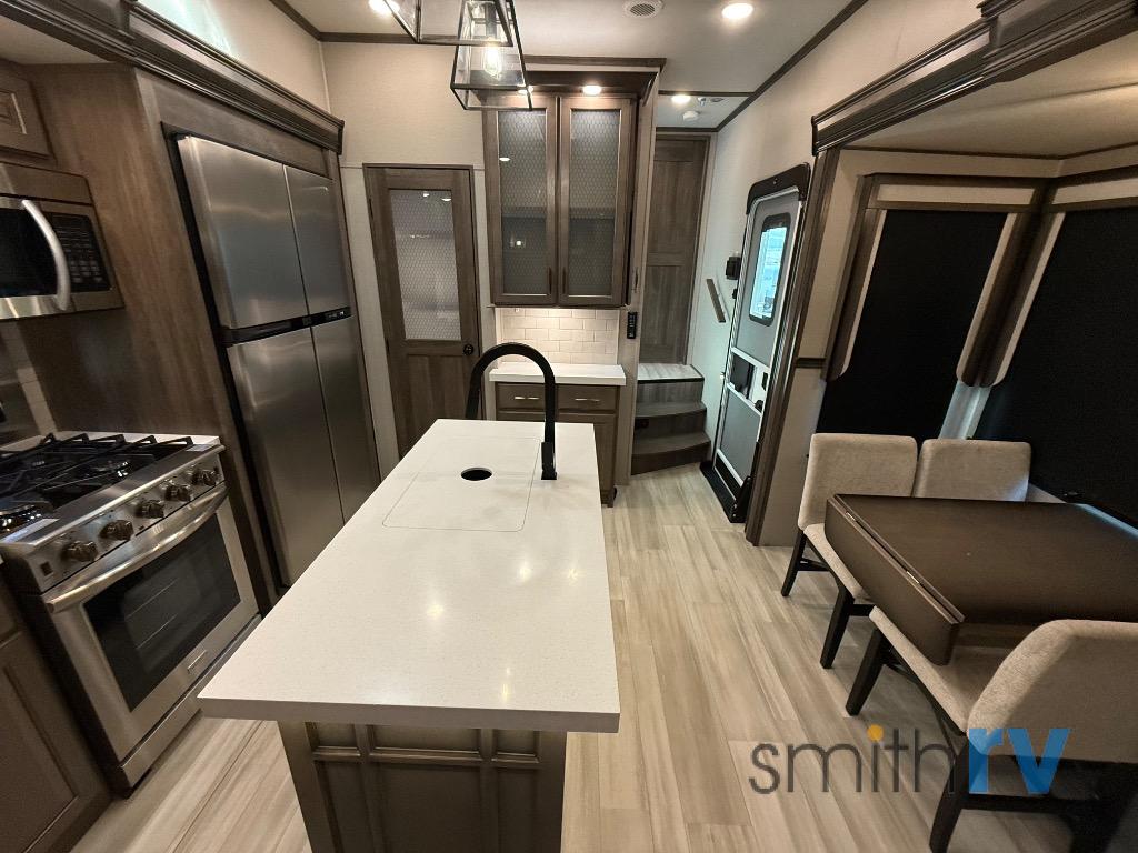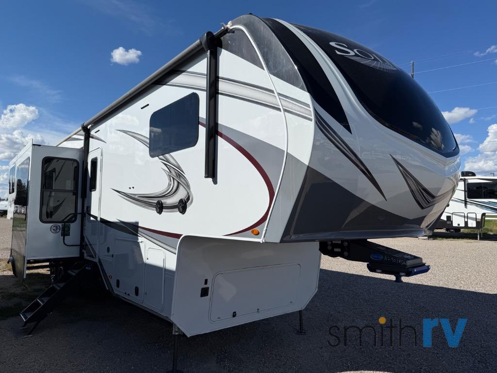 Your extended stays at any location will be enjoyable in this fifth wheel with the separate rooms, the five slide outs and the storage found inside as well as outside! The exterior rear storage with sliding tray is super handy to carry the larger camping items and totes plus there are several other compartments for items such as charcoal, outdoor games, hiking boots, fishing gear and more. The separate rear entertainment and living area provides an LED TV with fireplace below, several windows for great views, furniture to relax on as well as sleep on, plus USB charging outlets for your cellphones and such. The middle kitchen offers a buffet, a hutch, an oversized pantry, stainless steel appliances, and a free-standing dinette slide out with more views out of the windows. The full bathroom is up a few steps and before you reach the front bedroom. You will love the seated shower and linen storage. The bedroom provides a queen bed slide, a pull-out ottoman, a flip-up dresser with LED TV, and a mirrored wardrobe. There are a few more options to add if you wish such as a washer/dryer, an outside pull-out kitchen, and/or a Solitude solar system.