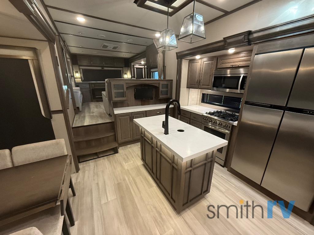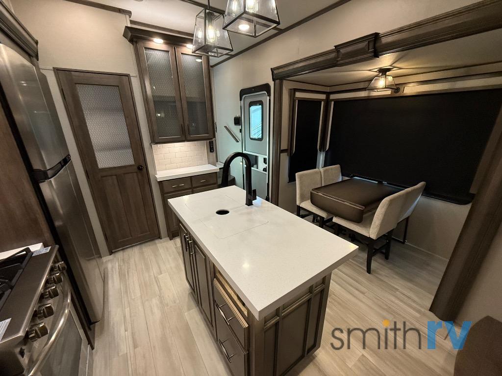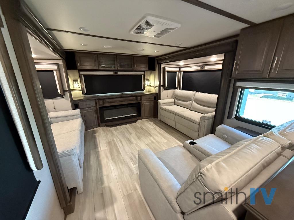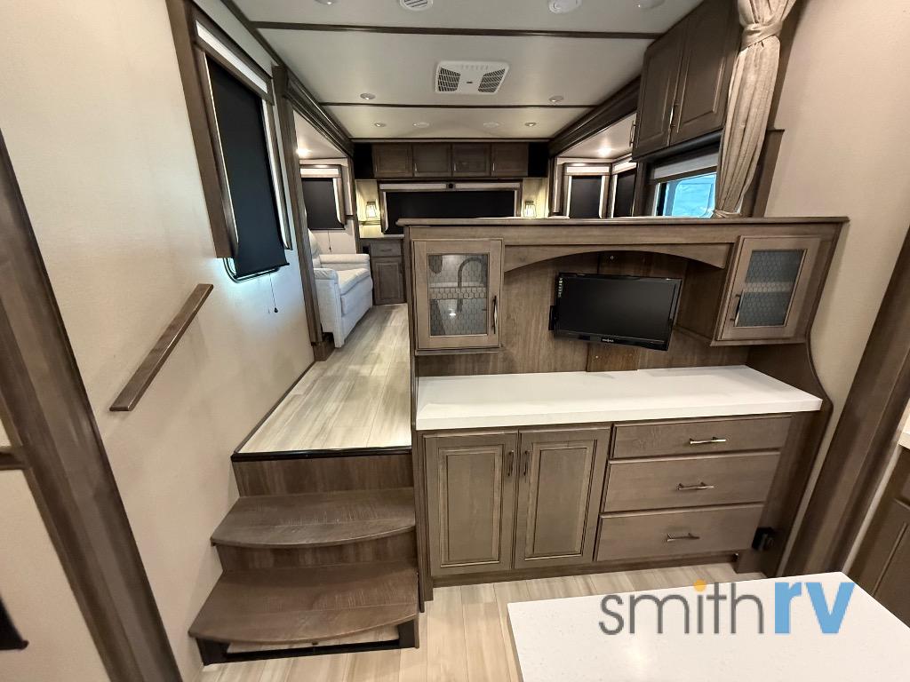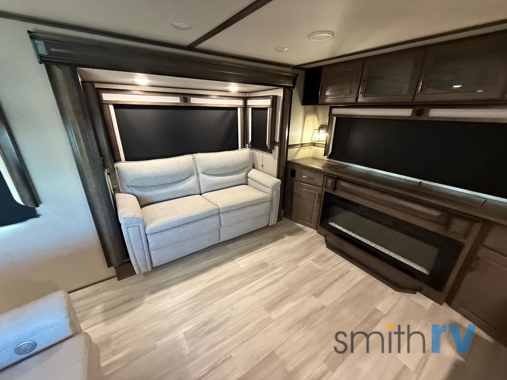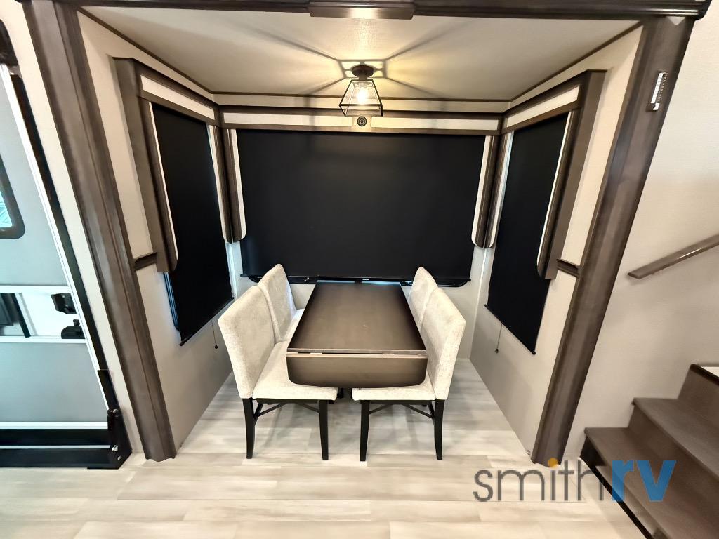 Your extended stays at any location will be enjoyable in this fifth wheel with the separate rooms, the five slide outs and the storage found inside as well as outside! The exterior rear storage with sliding tray is super handy to carry the larger camping items and totes plus there are several other compartments for items such as charcoal, outdoor games, hiking boots, fishing gear and more. The separate rear entertainment and living area provides an LED TV with fireplace below, several windows for great views, furniture to relax on as well as sleep on, plus USB charging outlets for your cellphones and such. The middle kitchen offers a buffet, a hutch, an oversized pantry, stainless steel appliances, and a free-standing dinette slide out with more views out of the windows. The full bathroom is up a few steps and before you reach the front bedroom. You will love the seated shower and linen storage. The bedroom provides a queen bed slide, a pull-out ottoman, a flip-up dresser with LED TV, and a mirrored wardrobe. There are a few more options to add if you wish such as a washer/dryer, an outside pull-out kitchen, and/or a Solitude solar system.