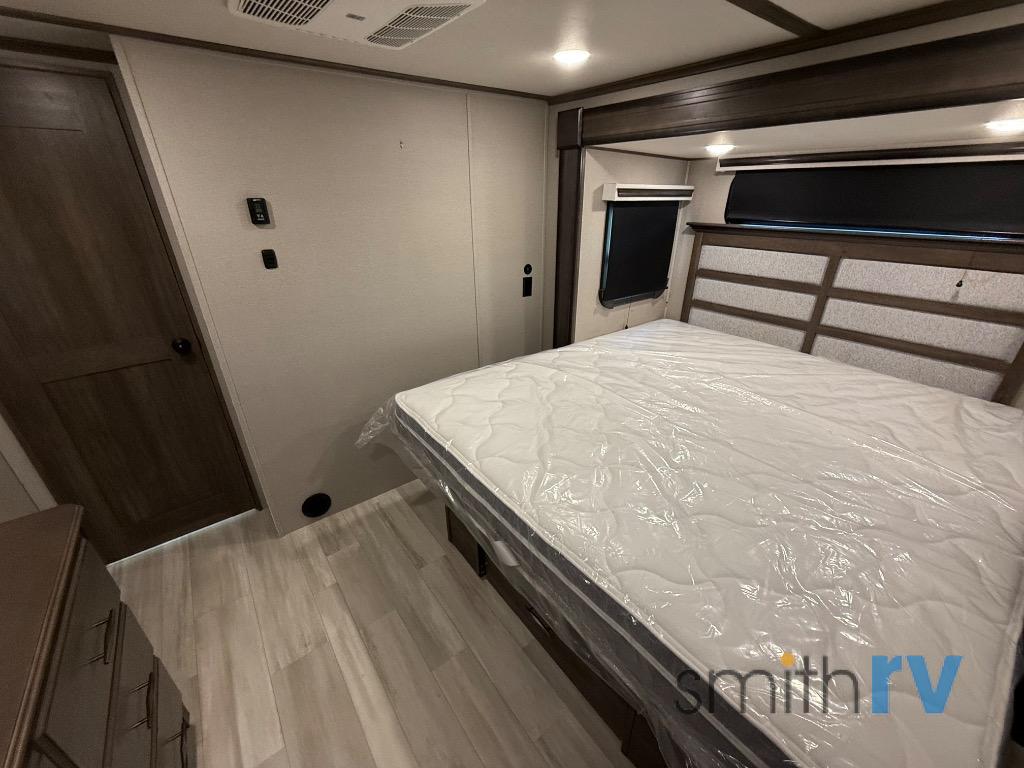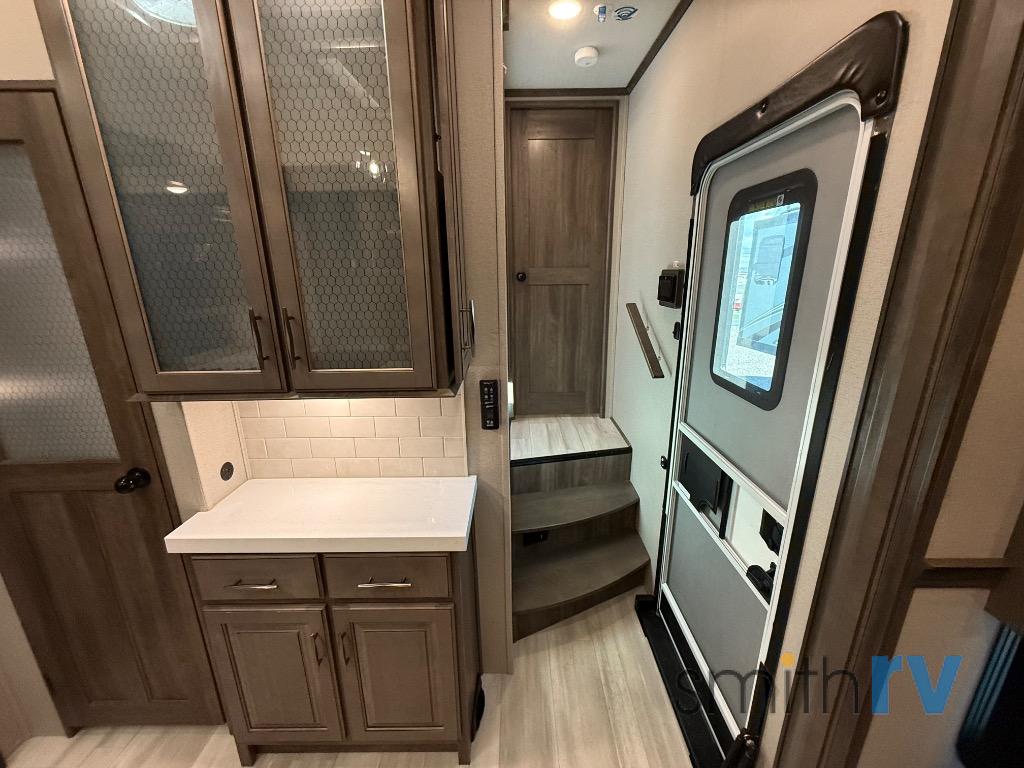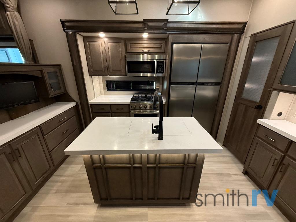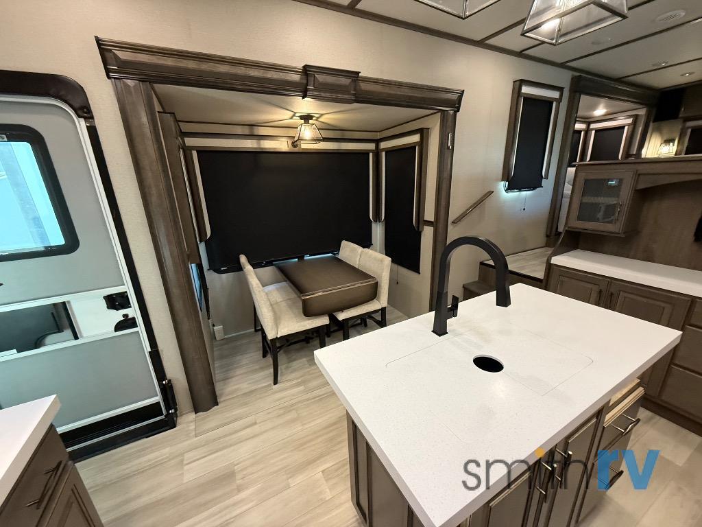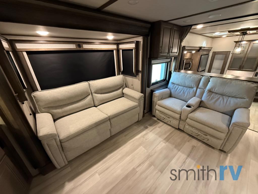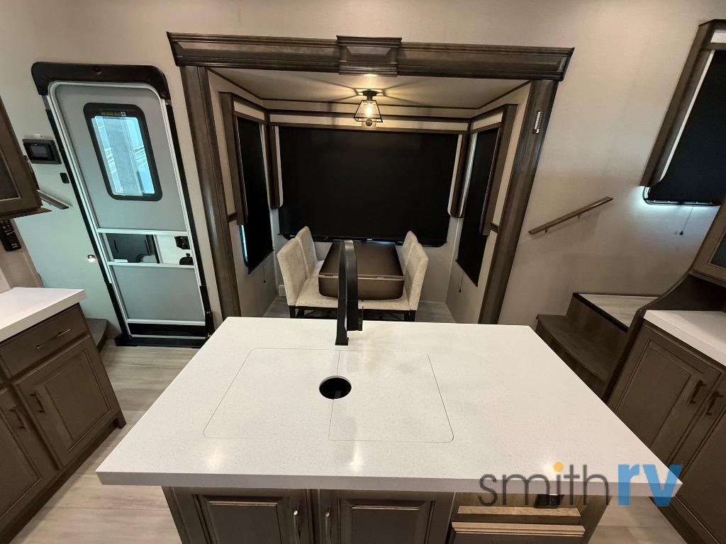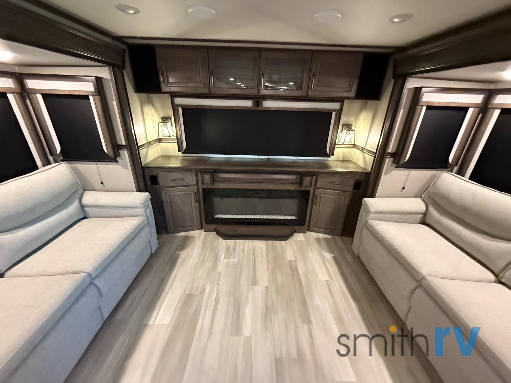Your extended stays at any location will be enjoyable in this fifth wheel with the separate rooms, the five slide outs and the storage found inside as well as outside! The exterior rear storage with sliding tray is super handy to carry the larger camping items and totes plus there are several other compartments for items such as charcoal, outdoor games, hiking boots, fishing gear and more. The separate rear entertainment and living area provides an LED TV with fireplace below, several windows for great views, furniture to relax on as well as sleep on, plus USB charging outlets for your cellphones and such. The middle kitchen offers a buffet, a hutch, an oversized pantry, stainless steel appliances, and a free-standing dinette slide out with more views out of the windows. The full bathroom is up a few steps and before you reach the front bedroom. You will love the seated shower and linen storage. The bedroom provides a queen bed slide, a pull-out ottoman, a flip-up dresser with LED TV, and a mirrored wardrobe. There are a few more options to add if you wish such as a washer/dryer, an outside pull-out kitchen, and/or a Solitude solar system.