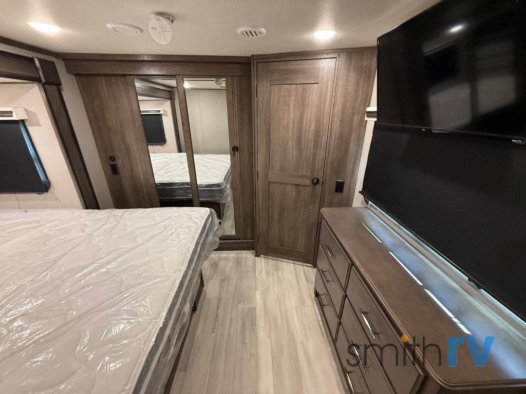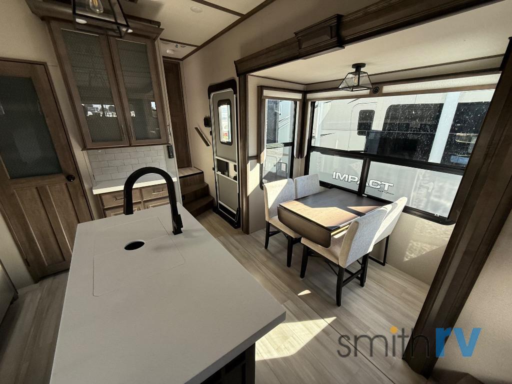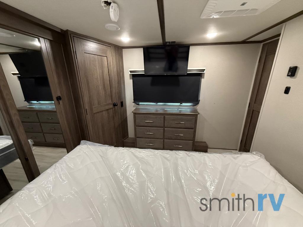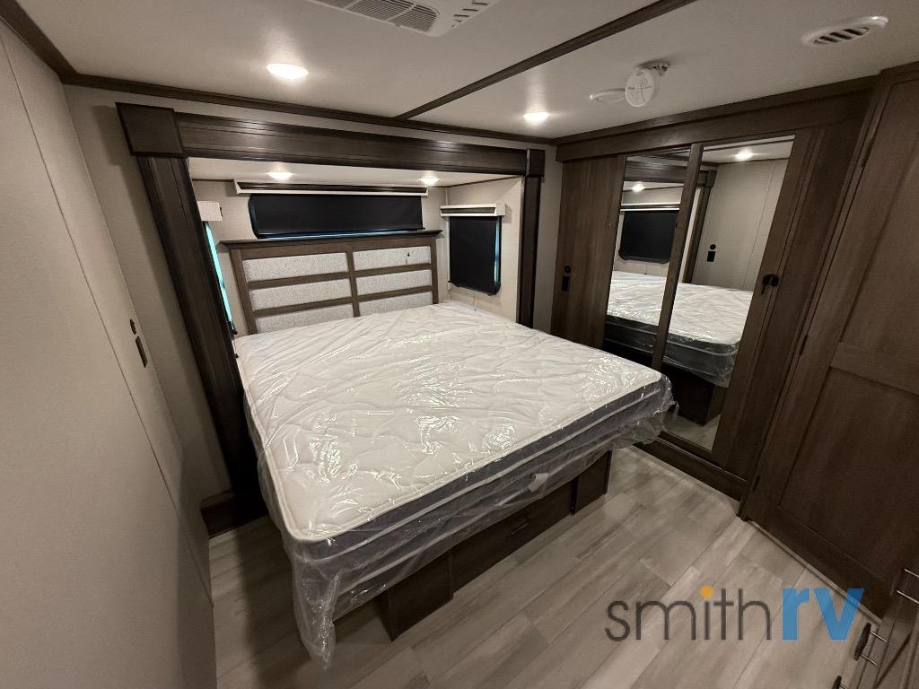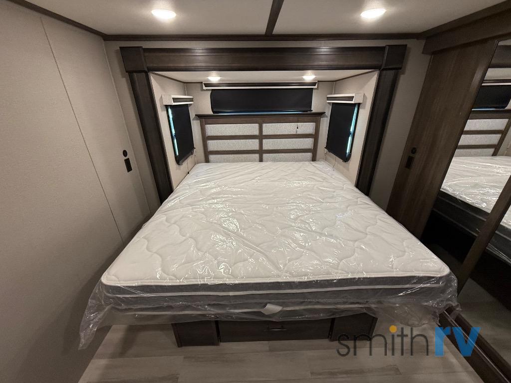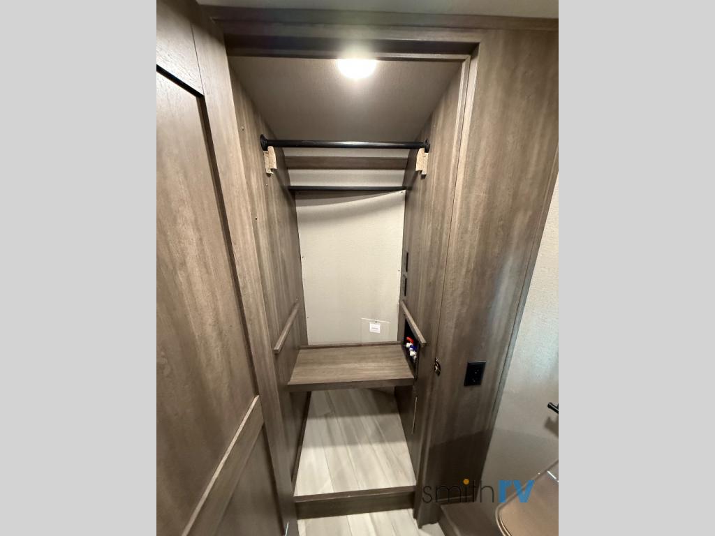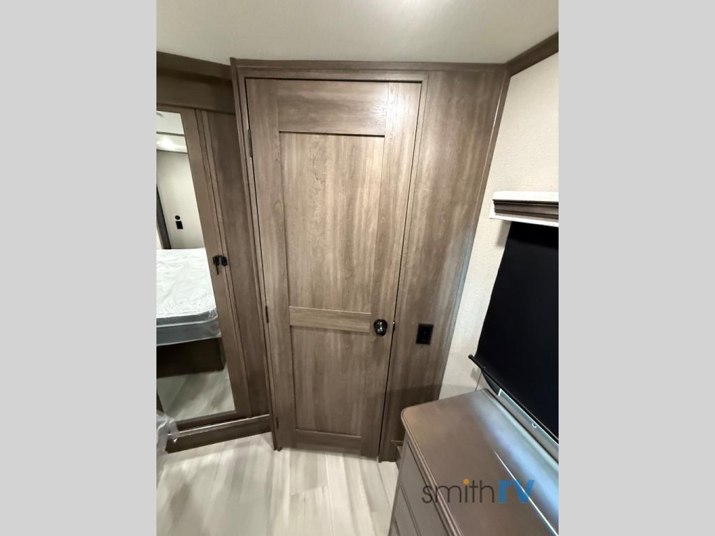 Your extended stays at any location will be enjoyable in this fifth wheel with the separate rooms, the five slide outs and the storage found inside as well as outside! The exterior rear storage with sliding tray is super handy to carry the larger camping items and totes plus there are several other compartments for items such as charcoal, outdoor games, hiking boots, fishing gear and more. The separate rear entertainment and living area provides an LED TV with fireplace below, several windows for great views, furniture to relax on as well as sleep on, plus USB charging outlets for your cellphones and such. The middle kitchen offers a buffet, a hutch, an oversized pantry, stainless steel appliances, and a free-standing dinette slide out with more views out of the windows. The full bathroom is up a few steps and before you reach the front bedroom. You will love the seated shower and linen storage. The bedroom provides a queen bed slide, a pull-out ottoman, a flip-up dresser with LED TV, and a mirrored wardrobe. There are a few more options to add if you wish such as a washer/dryer, an outside pull-out kitchen, and/or a Solitude solar system.