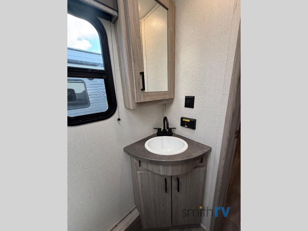 The Passport SL travel trailers by Keystone RV come in a compact design with travel-friendly lengths that are lightweight and easy to tow behind many smaller crossover SUVs. You will find several residential-style features such as durable Armstrong vinyl flooring, upgraded window treatments and valances, and bathroom countertops. The exterior shower with hot and cold water is very useful as you get cleaned up before entering the RV, wash your pets, or even rinse a few dishes outside. The Passport also now contains a HyperDeck flooring system which is a high-performance, water-resistant RV floor that comes as a breakthrough design from the Keystone Innovation Lab. This flooring is more resilient, stronger, and lighter than traditional laminated wood construction.