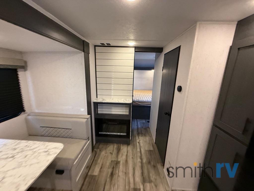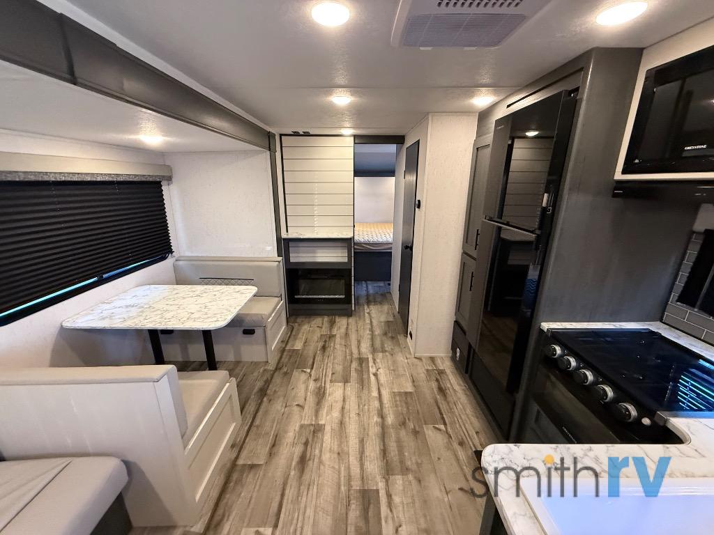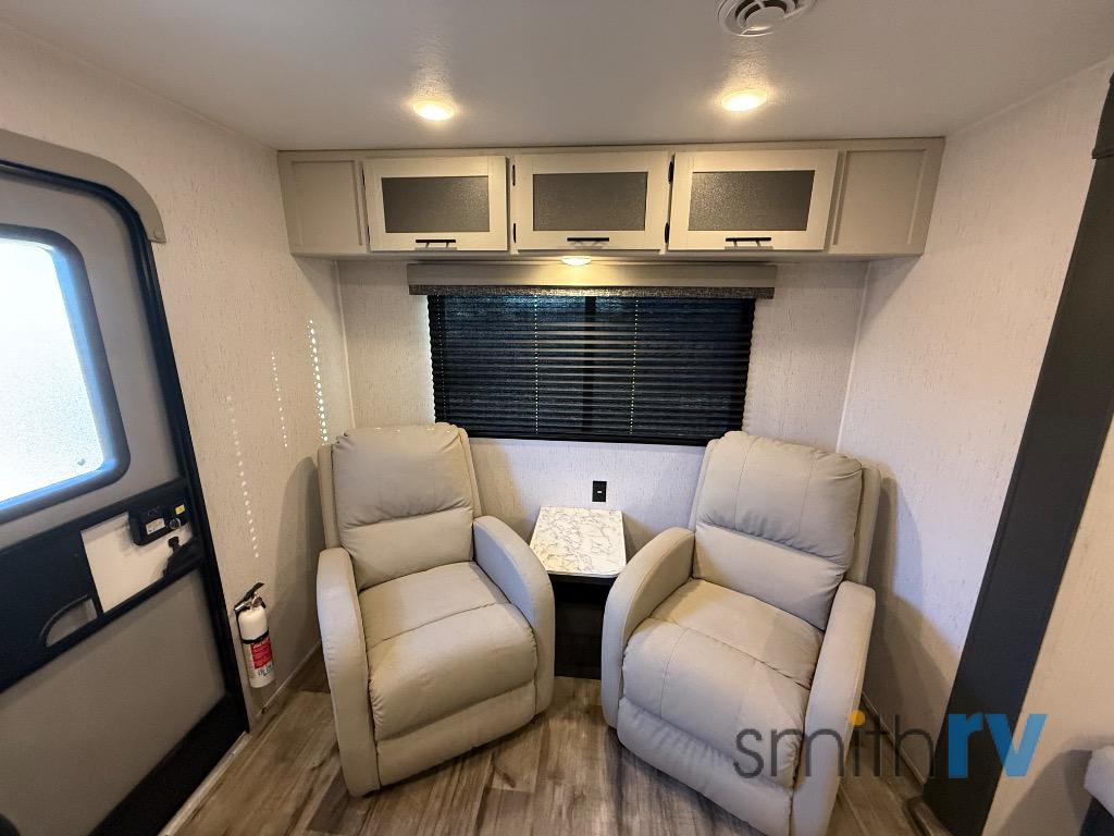 With dual entry doors, you can easily enter and exit this travel trailer! The jackknife sofa with footrest and booth dinette are next to each other near the fireplace, as well as two rear recliners allowing you to visit with other RVers or your family. The cook will have an oven and a microwave to make meals, and a 10 cu. ft. 12V refrigerator for cold items, plus a galley sink with high rise faucet to keep the dishes clean. Speaking of being clean, the full bathroom offers a shower with exhaust fan to eliminate unwanted steam as you clean yourself up after a fun day at the beach. The front private bedroom has a residential queen bed and one of the entrance/exit doors so you can slip out for an early morning fishing trip!